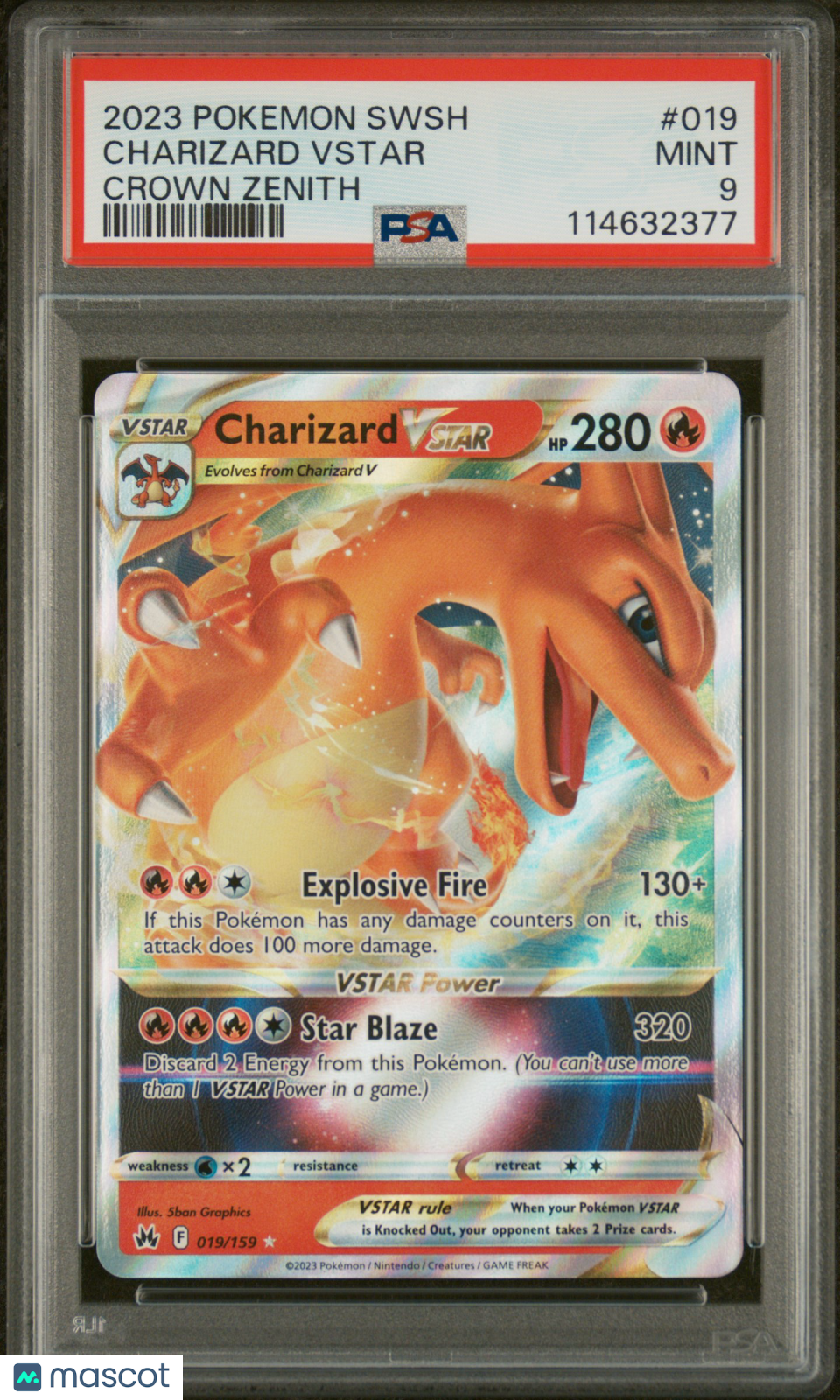 | *This is a Single Trading Card* | *Discounts are not available on Single Trading Cards* | This is a nice example of a 2023 Pokemon Sword And Shield Crown Zenith #019 Charizard Vstar Crown Zenith PSA 9 MINT. Please check out our other listings for more great cards. Thank you for your interest in one of our cards!!! Prior to making any bids/purchases, I would kindly ask you to read the information below: Item Condition Please see the provided pictures for the condition of the card or item, pictures of the front and back are provided for your review. We cannot accommodate requests for additional pictures. Any notable flaws or damage to this item will be noted in this listing. Please use the attached photos provided for your own assessment. Graded card cases may come with some minor wear/tear, surface scratch, chipped, or blemish. There are no partial refunds or returns because of the case condition. All single cards will come in protective cases. If you purchase a listing that's sold as a lot it may come in snap cases or sealed in a team bag, and not all cards will be individually sleeved and top loaded in all lots. Raw cards are sold as such, with no guarantees of potential and/or expected grades. All cards are sold as is, with no returns or refunds.