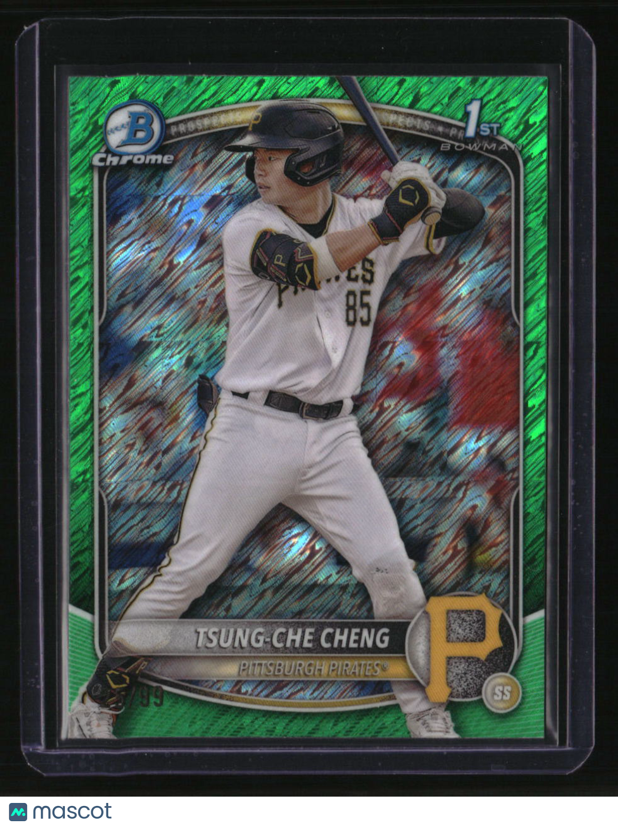 | *This is a Single Trading Card* | *Discounts are not available on Single Trading Cards* | This is a nice example of a 2025 Bowman #BCP-95 Tsung-Che Cheng Chrome Prospects Green Shimmer Refractor SN. Please check out our other listings for more great cards. Thank you for your interest in one of our cards!!! Prior to making any bids/purchases, I would kindly ask you to read the information below: Item Condition Please see the provided pictures for the condition of the card or item, pictures of the front and back are provided for your review. We cannot accommodate requests for additional pictures. Any notable flaws or damage to this item will be noted in this listing. Please use the attached photos provided for your own assessment. Graded card cases may come with some minor wear/tear, surface scratch, chipped, or blemish. There are no partial refunds or returns because of the case condition. All single cards will come in protective cases. If you purchase a listing that's sold as a lot it may come in snap cases or sealed in a team bag, and not all cards will be individually sleeved and top loaded in all lots. Raw cards are sold as such, with no guarantees of potential and/or expected grades. All cards are sold as is, with no returns or refunds. Listed With Mascot.