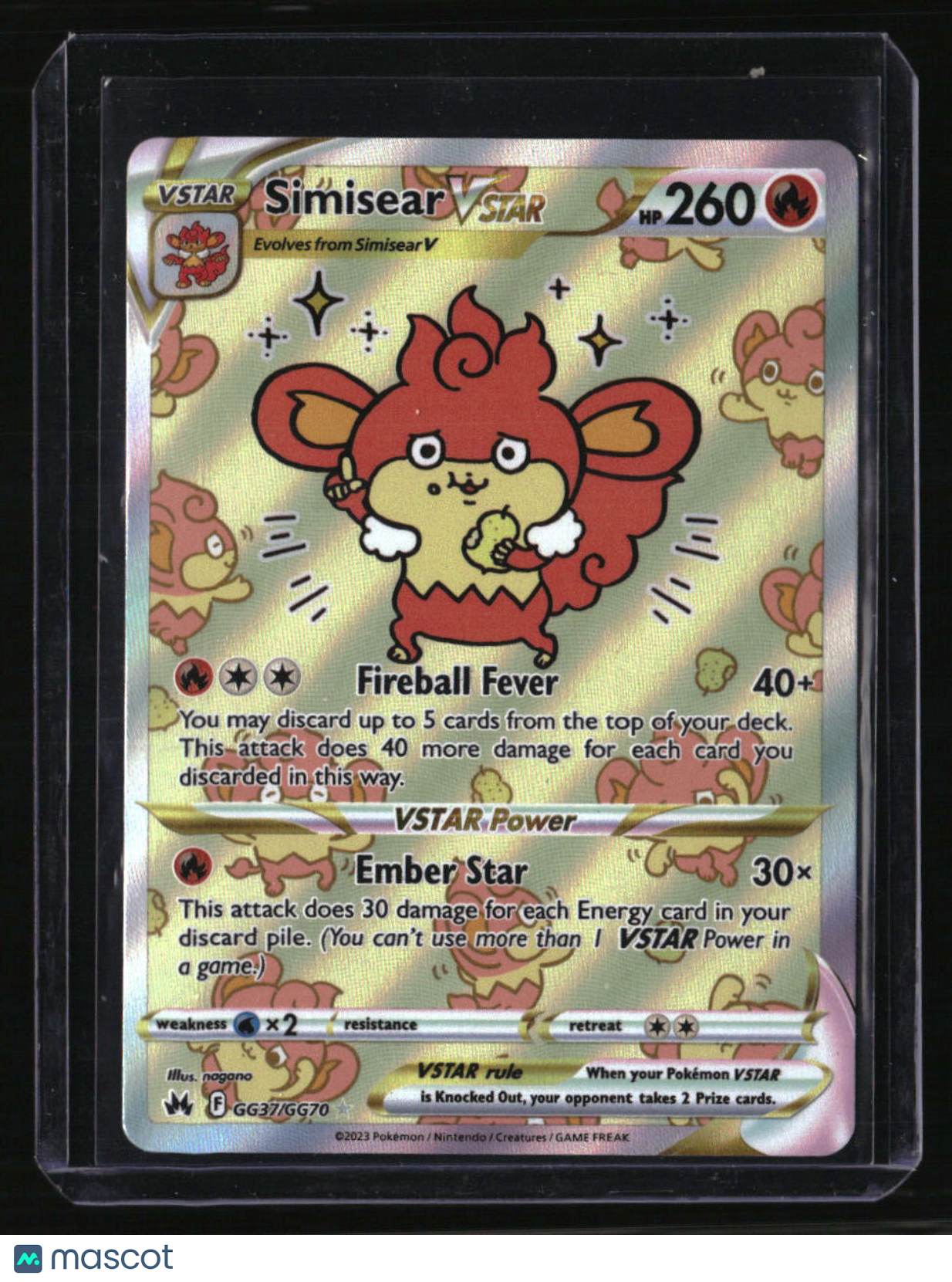 | *This is a Single Trading Card* | *Discounts are not available on Single Trading Cards* | This is a nice example of a Crown Zenith: Galarian Gallery #GG37/GG70 Simisear VSTAR Ultra Rare. Please check out our other listings for more great cards. Thank you for your interest in one of our cards!!! Prior to making any bids/purchases, I would kindly ask you to read the information below: Item Condition Please see the provided pictures for the condition of the card or item, pictures of the front and back are provided for your review. We cannot accommodate requests for additional pictures. Any notable flaws or damage to this item will be noted in this listing. Please use the attached photos provided for your own assessment. Graded card cases may come with some minor wear/tear, surface scratch, chipped, or blemish. There are no partial refunds or returns because of the case condition. All single cards will come in protective cases. If you purchase a listing that's sold as a lot it may come in snap cases or sealed in a team bag, and not all cards will be individually sleeved and top loaded in all lots. Raw cards are sold as such, with no guarantees of potential and/or expected grades. All cards are sold as is, with no returns or refunds. Listed With Mascot.