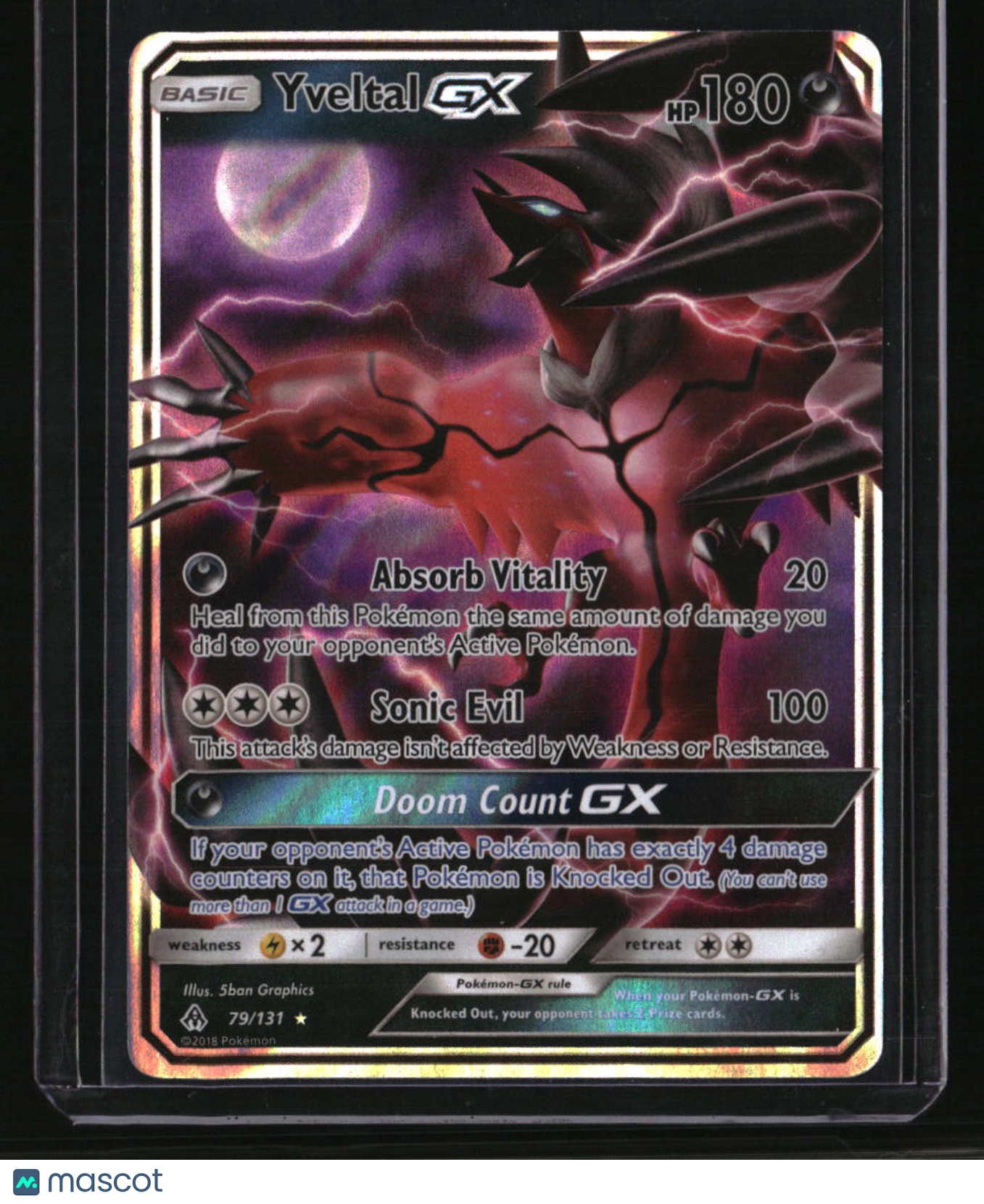 | *This is a Single Trading Card* | *Discounts are not available on Single Trading Cards* | This is a nice example of a SM - Forbidden Light #79/131 Yveltal GX Ultra Rare. Please check out our other listings for more great cards. Thank you for your interest in one of our cards!!! Prior to making any bids/purchases, I would kindly ask you to read the information below: Item Condition Please see the provided pictures for the condition of the card or item, pictures of the front and back are provided for your review. We cannot accommodate requests for additional pictures. Any notable flaws or damage to this item will be noted in this listing. Please use the attached photos provided for your own assessment. Graded card cases may come with some minor wear/tear, surface scratch, chipped, or blemish. There are no partial refunds or returns because of the case condition. All single cards will come in protective cases. If you purchase a listing that's sold as a lot it may come in snap cases or sealed in a team bag, and not all cards will be individually sleeved and top loaded in all lots. Raw cards are sold as such, with no guarantees of potential and/or expected grades. All cards are sold as is, with no returns or refunds. Listed With Mascot.