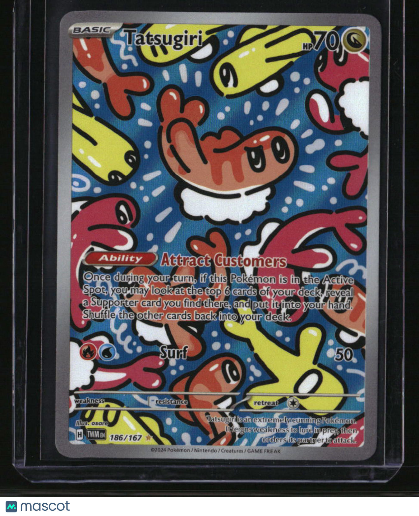 | *This is a Single Trading Card* | *Discounts are not available on Single Trading Cards* | This is a nice example of a SV06: Twilight Masquerade #186/167 Tatsugiri . Please check out our other listings for more great cards. Thank you for your interest in one of our cards!!! Prior to making any bids/purchases, I would kindly ask you to read the information below: Item Condition Please see the provided pictures for the condition of the card or item, pictures of the front and back are provided for your review. We cannot accommodate requests for additional pictures. Any notable flaws or damage to this item will be noted in this listing. Please use the attached photos provided for your own assessment. Graded card cases may come with some minor wear/tear, surface scratch, chipped, or blemish. There are no partial refunds or returns because of the case condition. All single cards will come in protective cases. If you purchase a listing that's sold as a lot it may come in snap cases or sealed in a team bag, and not all cards will be individually sleeved and top loaded in all lots. Raw cards are sold as such, with no guarantees of potential and/or expected grades. All cards are sold as is, with no returns or refunds. Listed With Mascot.