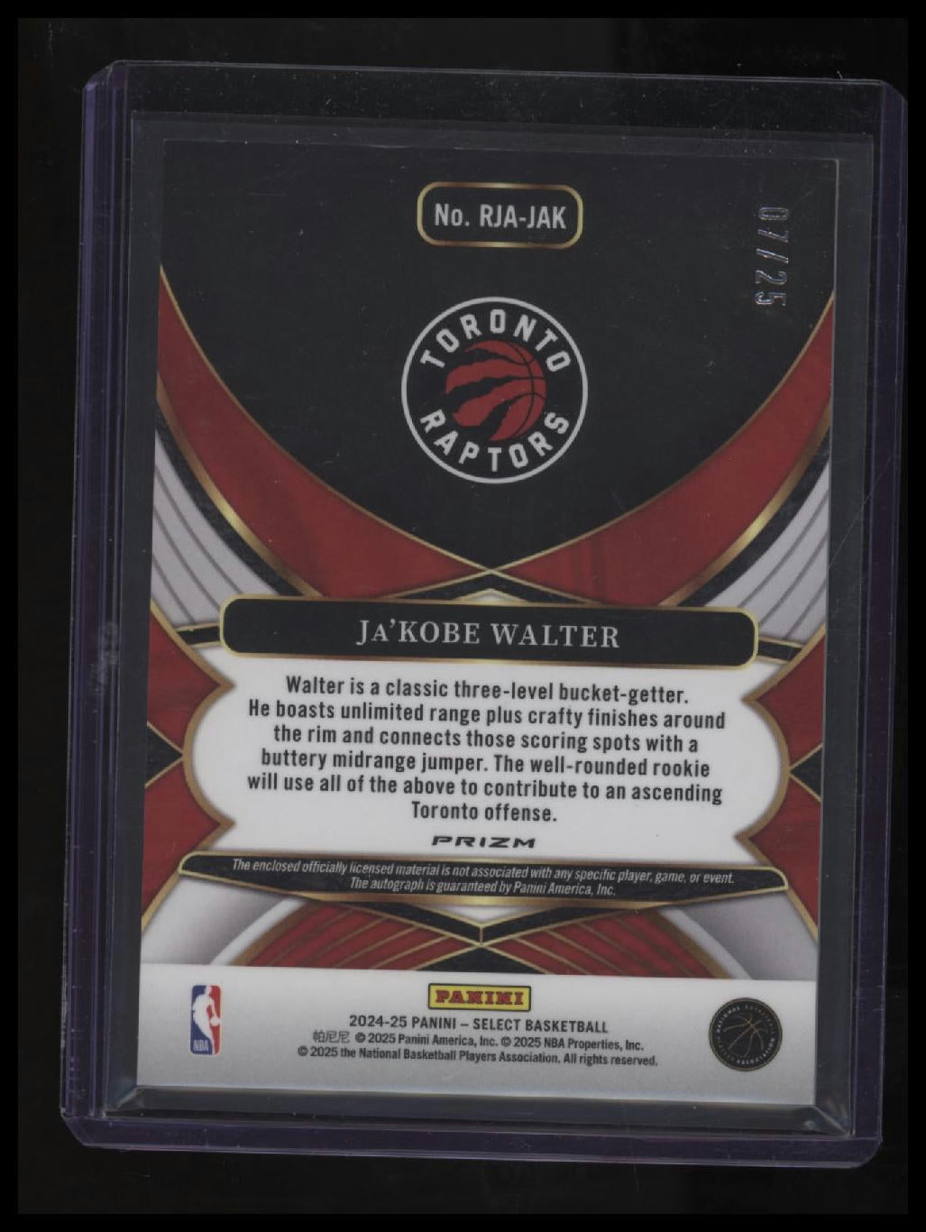 | *This is a Single Trading Card* | *Discounts are not available on Single Trading Cards* | This is a nice example of a 2024-25 Panini Select #RJA-JAK Ja’Kobe Walter Rookie Jersey Autographs Tie Dye Prizms SN,MEM,AU. Please check out our other listings for more great cards. Thank you for your interest in one of our cards!!! Prior to making any bids/purchases, I would kindly ask you to read the information below: Item Condition Please see the provided pictures for the condition of the card or item, pictures of the front and back are provided for your review. We cannot accommodate requests for additional pictures. Any notable flaws or damage to this item will be noted in this listing. Please use the attached photos provided for your own assessment. Graded card cases may come with some minor wear/tear, surface scratch, chipped, or blemish. There are no partial refunds or returns because of the case condition. All single cards will come in protective cases. If you purchase a listing that's sold as a lot it may come in snap cases or sealed in a team bag, and not all cards will be individually sleeved and top loaded in all lots. Raw cards are sold as such, with no guarantees of potential and/or expected grades. All cards are sold as is, with no returns or refunds. Listed With Mascot.