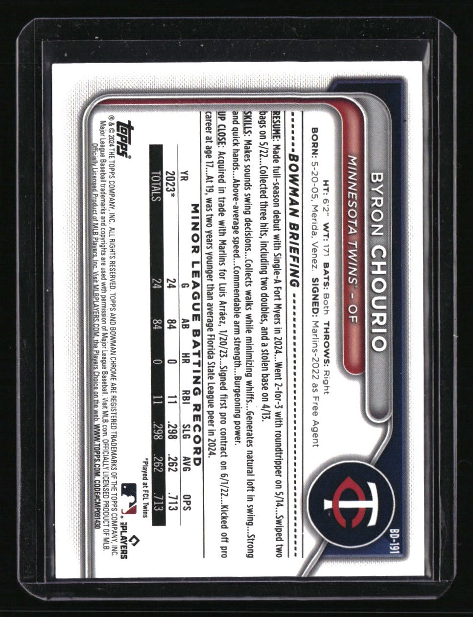 | *This is a Single Trading Card* | *Discounts are not available on Single Trading Cards* | This is a nice example of a 2024 Bowman Draft #BD-191 Byron Chourio Red SN. Please check out our other listings for more great cards. Thank you for your interest in one of our cards!!! Prior to making any bids/purchases, I would kindly ask you to read the information below: Item Condition Please see the provided pictures for the condition of the card or item, pictures of the front and back are provided for your review. We cannot accommodate requests for additional pictures. Any notable flaws or damage to this item will be noted in this listing. Please use the attached photos provided for your own assessment. Graded card cases may come with some minor wear/tear, surface scratch, chipped, or blemish. There are no partial refunds or returns because of the case condition. All single cards will come in protective cases. If you purchase a listing that's sold as a lot it may come in snap cases or sealed in a team bag, and not all cards will be individually sleeved and top loaded in all lots. Raw cards are sold as such, with no guarantees of potential and/or expected grades. All cards are sold as is, with no returns or refunds. Listed With Mascot.