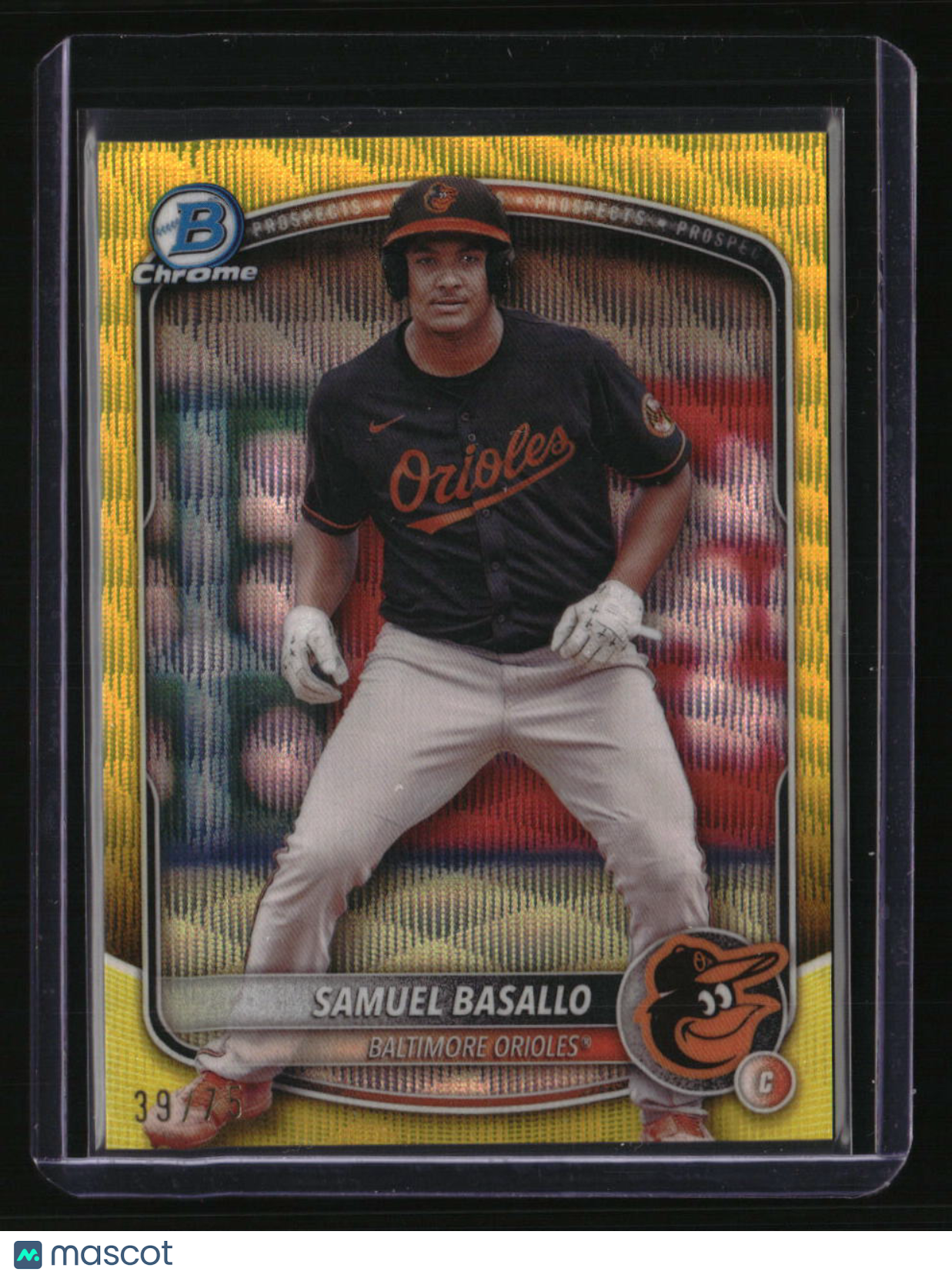 | *This is a Single Trading Card* | *Discounts are not available on Single Trading Cards* | This is a nice example of a 2025 Bowman #BCP-109 Samuel Basallo Chrome Prospects Yellow Wave Refractor SN. Please check out our other listings for more great cards. Thank you for your interest in one of our cards!!! Prior to making any bids/purchases, I would kindly ask you to read the information below: Item Condition Please see the provided pictures for the condition of the card or item, pictures of the front and back are provided for your review. We cannot accommodate requests for additional pictures. Any notable flaws or damage to this item will be noted in this listing. Please use the attached photos provided for your own assessment. Graded card cases may come with some minor wear/tear, surface scratch, chipped, or blemish. There are no partial refunds or returns because of the case condition. All single cards will come in protective cases. If you purchase a listing that's sold as a lot it may come in snap cases or sealed in a team bag, and not all cards will be individually sleeved and top loaded in all lots. Raw cards are sold as such, with no guarantees of potential and/or expected grades. All cards are sold as is, with no returns or refunds. Listed With Mascot.