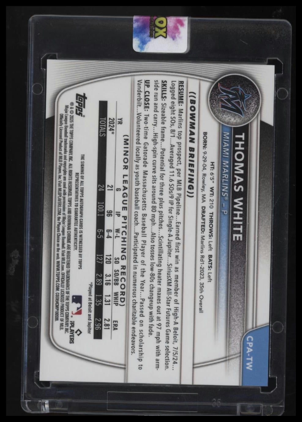 | *This is a Single Trading Card* | *Discounts are not available on Single Trading Cards* | This is a nice example of a 2025 Bowman #CPA-TW Thomas White Chrome Prospects Autographs Gold Lava Refractor SN,AU. Please check out our other listings for more great cards. Thank you for your interest in one of our cards!!! Prior to making any bids/purchases, I would kindly ask you to read the information below: Item Condition Please see the provided pictures for the condition of the card or item, pictures of the front and back are provided for your review. We cannot accommodate requests for additional pictures. Any notable flaws or damage to this item will be noted in this listing. Please use the attached photos provided for your own assessment. Graded card cases may come with some minor wear/tear, surface scratch, chipped, or blemish. There are no partial refunds or returns because of the case condition. All single cards will come in protective cases. If you purchase a listing that's sold as a lot it may come in snap cases or sealed in a team bag, and not all cards will be individually sleeved and top loaded in all lots. Raw cards are sold as such, with no guarantees of potential and/or expected grades. All cards are sold as is, with no returns or refunds. Listed With Mascot.