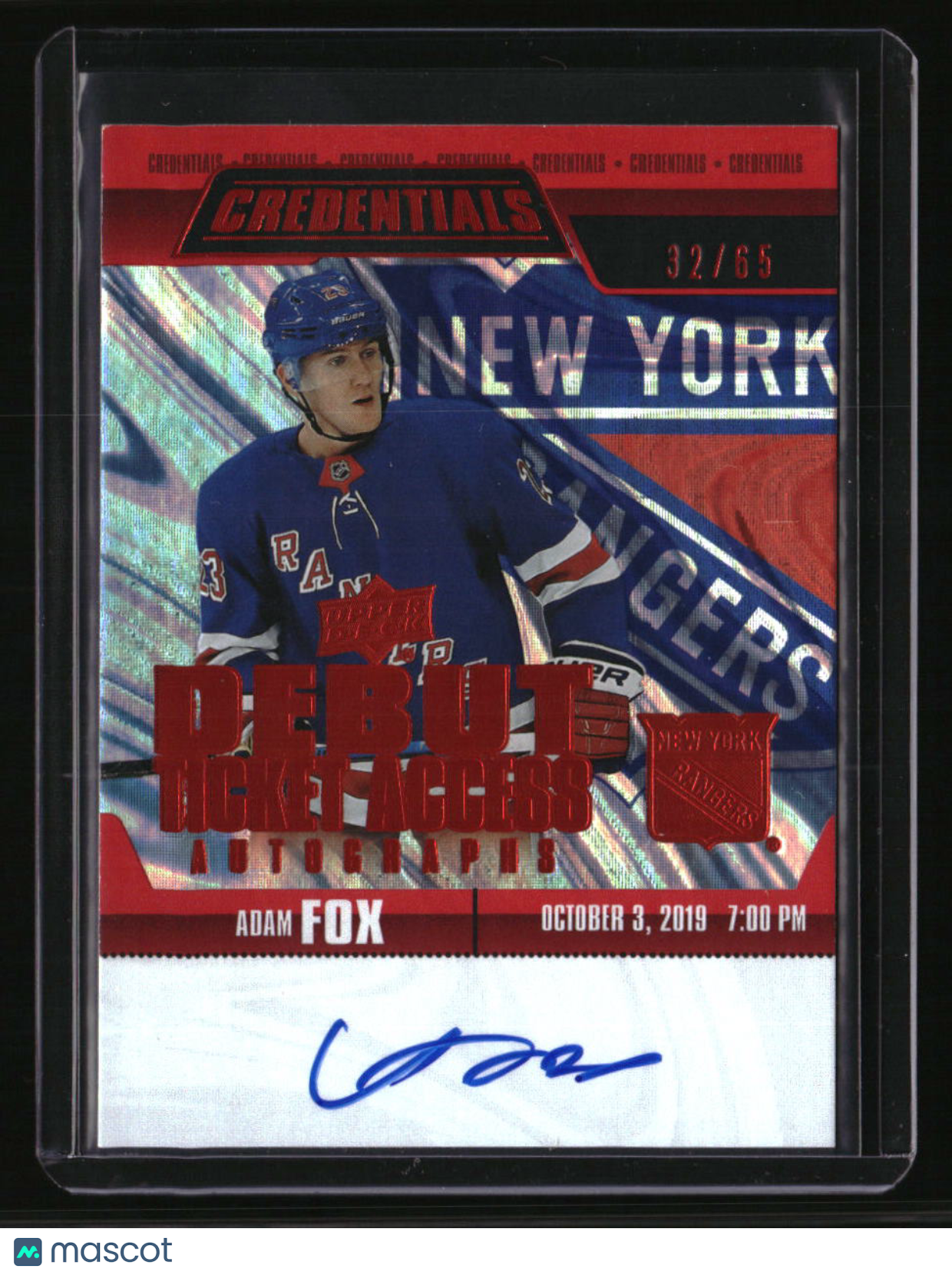 Adam Fox 2019-20 Upper Deck Credentials Debut Ticket Access Autographs Red #/65