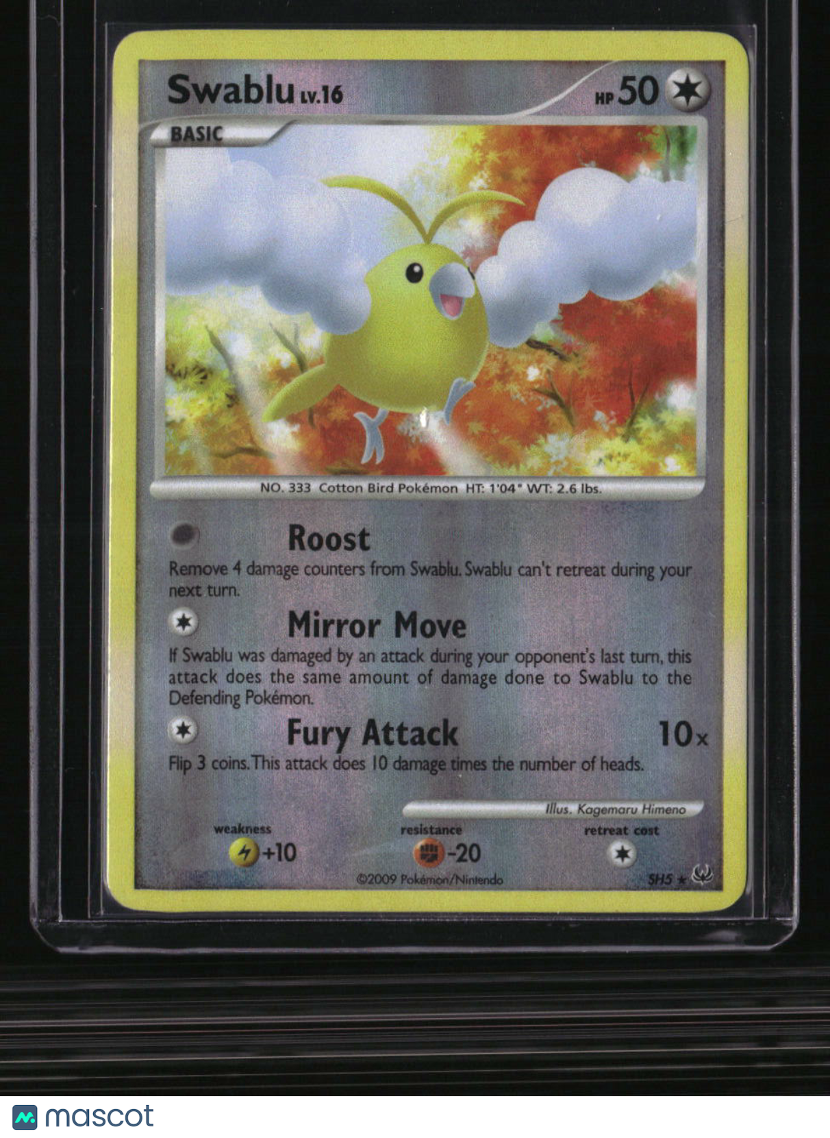 | *This is a Single Trading Card* | *Discounts are not available on Single Trading Cards* | This is a nice example of a Platinum #SH5 Swablu (Shiny) Shiny Holo Rare,Reverse Holo. Please check out our other listings for more great cards. Thank you for your interest in one of our cards!!! Prior to making any bids/purchases, I would kindly ask you to read the information below: Item Condition Please see the provided pictures for the condition of the card or item, pictures of the front and back are provided for your review. We cannot accommodate requests for additional pictures. Any notable flaws or damage to this item will be noted in this listing. Please use the attached photos provided for your own assessment. Graded card cases may come with some minor wear/tear, surface scratch, chipped, or blemish. There are no partial refunds or returns because of the case condition. All single cards will come in protective cases. If you purchase a listing that's sold as a lot it may come in snap cases or sealed in a team bag, and not all cards will be individually sleeved and top loaded in all lots. Raw cards are sold as such, with no guarantees of potential and/or expected grades. All cards are sold as is, with no returns or refunds. Listed With Mascot.