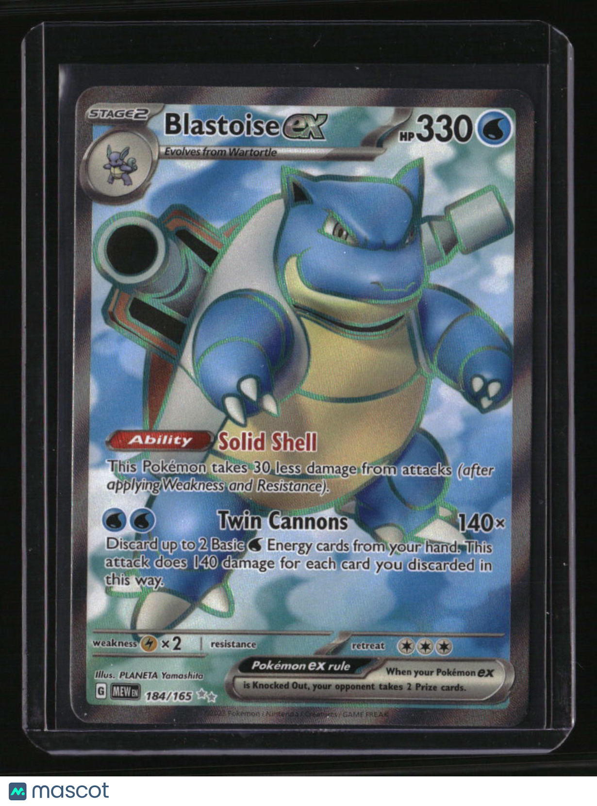 | *This is a Single Trading Card* | *Discounts are not available on Single Trading Cards* | This is a nice example of a SV: Scarlet & Violet 151 #184/165 Blastoise ex Ultra Rare,Holo. Please check out our other listings for more great cards. Thank you for your interest in one of our cards!!! Prior to making any bids/purchases, I would kindly ask you to read the information below: Item Condition Please see the provided pictures for the condition of the card or item, pictures of the front and back are provided for your review. We cannot accommodate requests for additional pictures. Any notable flaws or damage to this item will be noted in this listing. Please use the attached photos provided for your own assessment. Graded card cases may come with some minor wear/tear, surface scratch, chipped, or blemish. There are no partial refunds or returns because of the case condition. All single cards will come in protective cases. If you purchase a listing that's sold as a lot it may come in snap cases or sealed in a team bag, and not all cards will be individually sleeved and top loaded in all lots. Raw cards are sold as such, with no guarantees of potential and/or expected grades. All cards are sold as is, with no returns or refunds. Listed With Mascot.