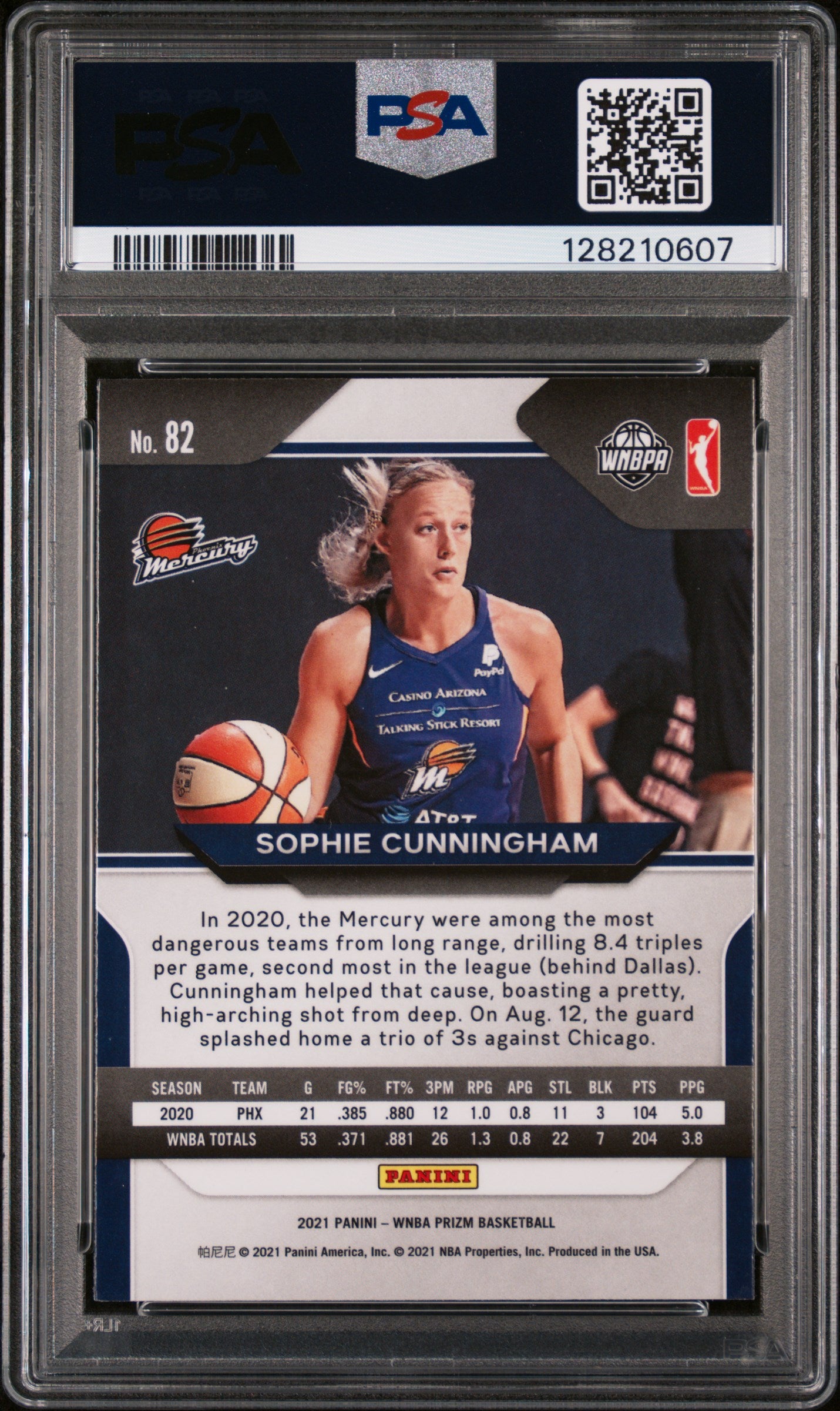 | *This is a Single Trading Card* | *Discounts are not available on Single Trading Cards* | This is a nice example of a 2021 Panini Prizm Wnba #82 Sophie Cunningham PSA 9 MINT. Please check out our other listings for more great cards. Thank you for your interest in one of our cards!!! Prior to making any bids/purchases, I would kindly ask you to read the information below: Item Condition Please see the provided pictures for the condition of the card or item, pictures of the front and back are provided for your review. We cannot accommodate requests for additional pictures. Any notable flaws or damage to this item will be noted in this listing. Please use the attached photos provided for your own assessment. Graded card cases may come with some minor wear/tear, surface scratch, chipped, or blemish. There are no partial refunds or returns because of the case condition. All single cards will come in protective cases. If you purchase a listing that's sold as a lot it may come in snap cases or sealed in a team bag, and not all cards will be individually sleeved and top loaded in all lots. Raw cards are sold as such, with no guarantees of potential and/or expected grades. All cards are sold as is, with no returns or refunds. Listed With Mascot.