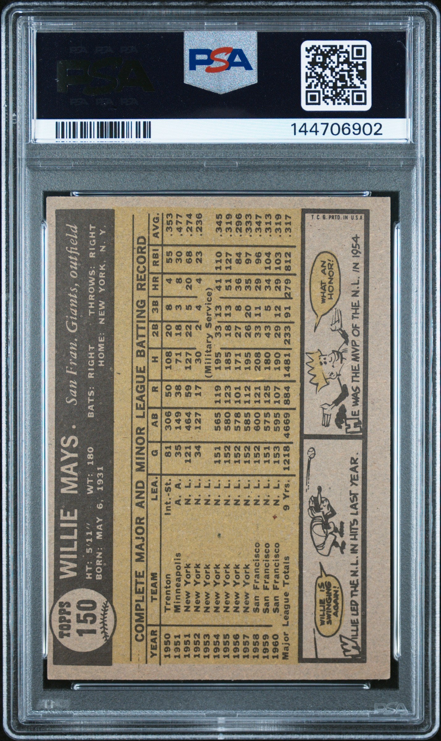 | *This is a Single Trading Card* | *Discounts are not available on Single Trading Cards* | This is a nice example of a 1961 Topps #150 Willie Mays PSA 5 EX. Please check out our other listings for more great cards. Thank you for your interest in one of our cards!!! Prior to making any bids/purchases, I would kindly ask you to read the information below: Item Condition Please see the provided pictures for the condition of the card or item, pictures of the front and back are provided for your review. We cannot accommodate requests for additional pictures. Any notable flaws or damage to this item will be noted in this listing. Please use the attached photos provided for your own assessment. Graded card cases may come with some minor wear/tear, surface scratch, chipped, or blemish. There are no partial refunds or returns because of the case condition. All single cards will come in protective cases. If you purchase a listing that's sold as a lot it may come in snap cases or sealed in a team bag, and not all cards will be individually sleeved and top loaded in all lots. Raw cards are sold as such, with no guarantees of potential and/or expected grades. All cards are sold as is, with no returns or refunds. Listed With Mascot.