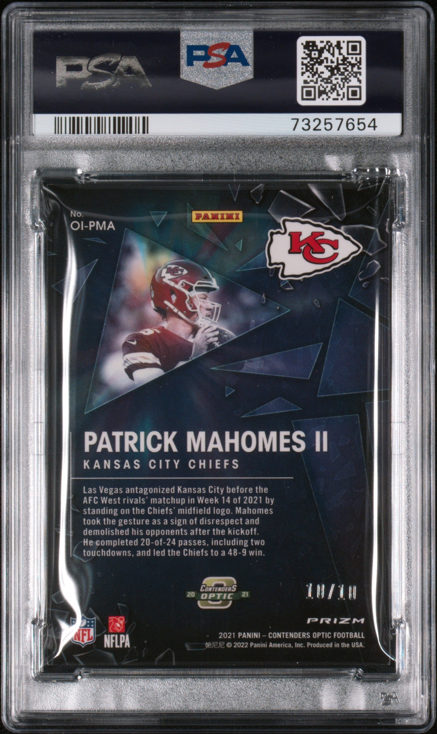 | *This is a Single Trading Card* | *Discounts are not available on Single Trading Cards* | This is a nice example of a 2021 Panini Contenders Optic Optic Illusion #OIPMA Patrick Mahomes Ii Optic Illusion-Gold PSA 9 MINT. Please check out our other listings for more great cards. Thank you for your interest in one of our cards!!! Prior to making any bids/purchases, I would kindly ask you to read the information below: Item Condition Please see the provided pictures for the condition of the card or item, pictures of the front and back are provided for your review. We cannot accommodate requests for additional pictures. Any notable flaws or damage to this item will be noted in this listing. Please use the attached photos provided for your own assessment. Graded card cases may come with some minor wear/tear, surface scratch, chipped, or blemish. There are no partial refunds or returns because of the case condition. All single cards will come in protective cases. If you purchase a listing that's sold as a lot it may come in snap cases or sealed in a team bag, and not all cards will be individually sleeved and top loaded in all lots. Raw cards are sold as such, with no guarantees of potential and/or expected grades. All cards are sold as is, with no returns or refunds. Listed With Mascot.