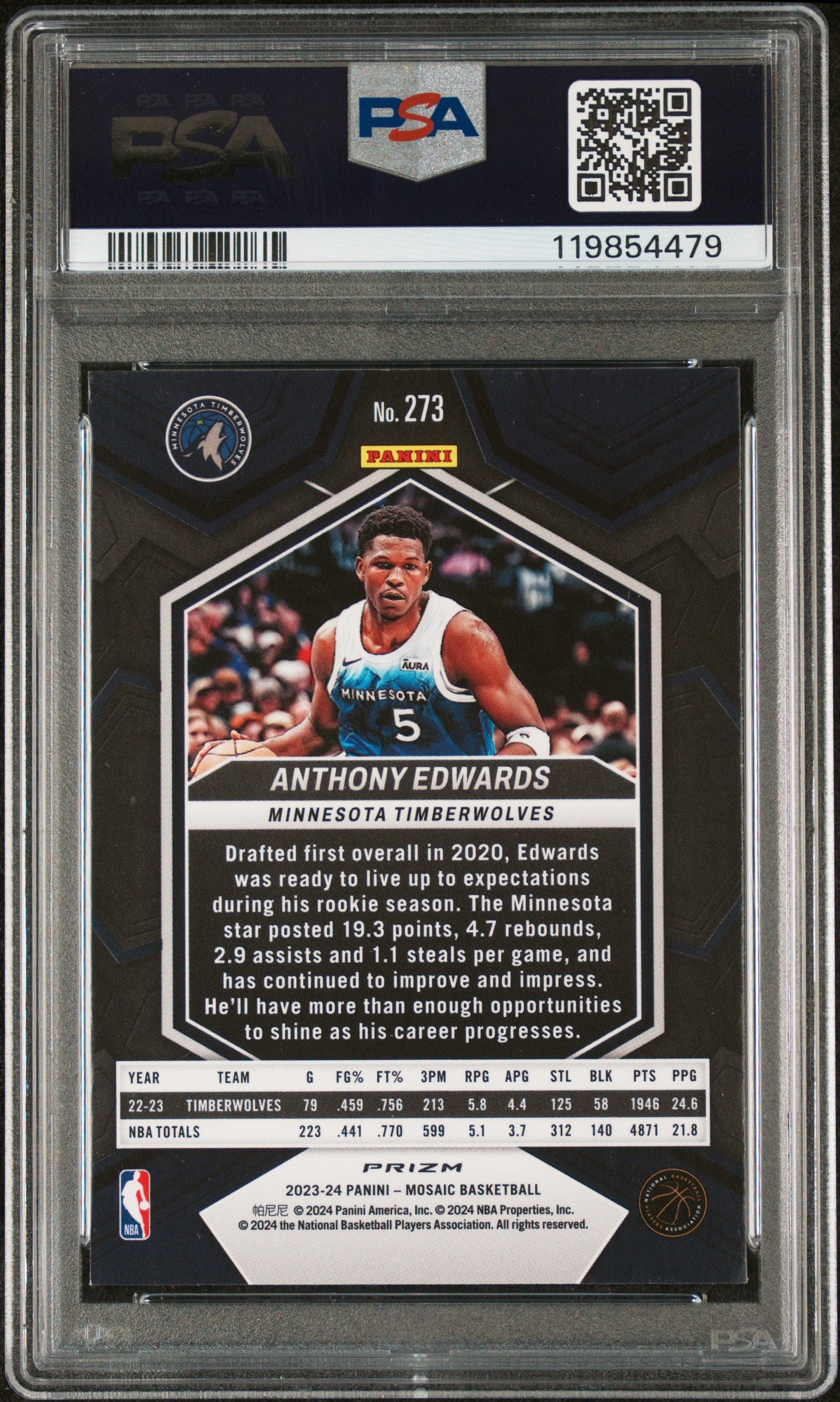 | *This is a Single Trading Card* | *Discounts are not available on Single Trading Cards* | This is a nice example of a 2023-24 Panini Mosaic #273 Anthony Edwards Genesis PSA 9 . Please check out our other listings for more great cards. Thank you for your interest in one of our cards!!! Prior to making any bids/purchases, I would kindly ask you to read the information below: Item Condition Please see the provided pictures for the condition of the card or item, pictures of the front and back are provided for your review. We cannot accommodate requests for additional pictures. Any notable flaws or damage to this item will be noted in this listing. Please use the attached photos provided for your own assessment. Graded card cases may come with some minor wear/tear, surface scratch, chipped, or blemish. There are no partial refunds or returns because of the case condition. All single cards will come in protective cases. If you purchase a listing that's sold as a lot it may come in snap cases or sealed in a team bag, and not all cards will be individually sleeved and top loaded in all lots. Raw cards are sold as such, with no guarantees of potential and/or expected grades. All cards are sold as is, with no returns or refunds. Listed With Mascot.