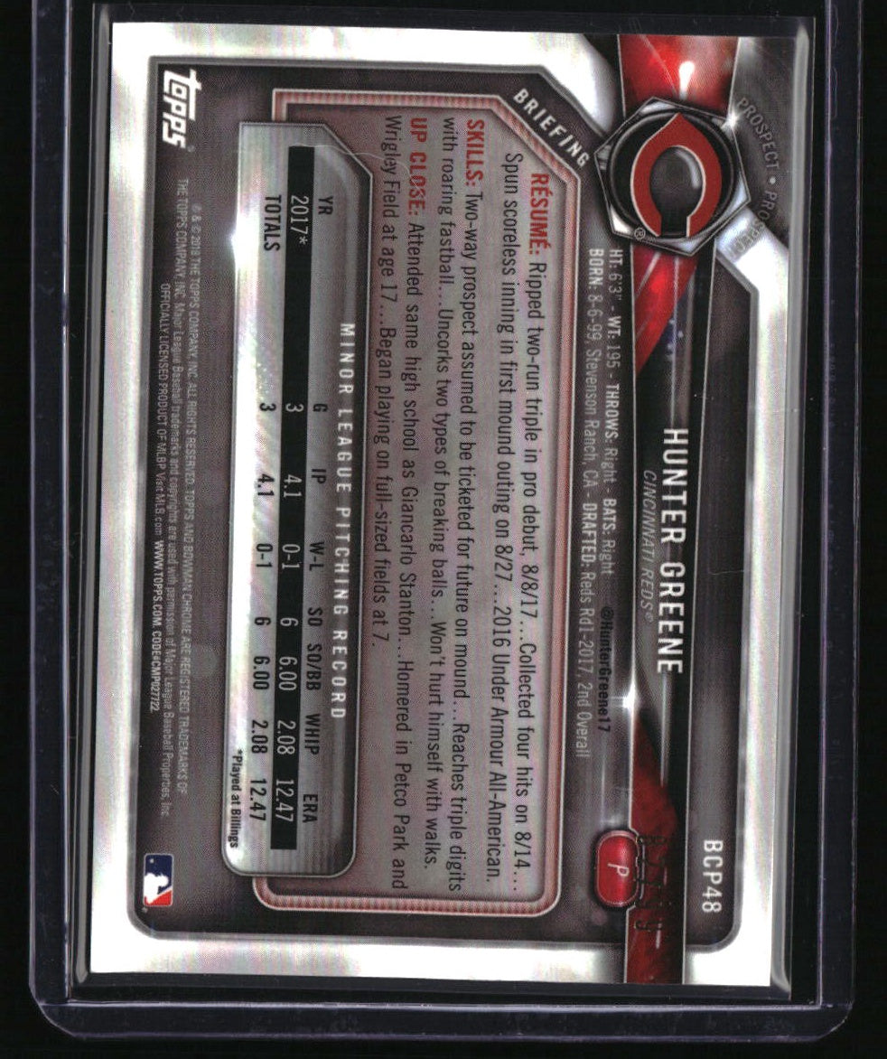 | *This is a Single Trading Card* | *Discounts are not available on Single Trading Cards* | This is a nice example of a 2018 Bowman #BCP48 Hunter Greene Chrome Prospects Mojo Refractor Green SN. Please check out our other listings for more great cards. Thank you for your interest in one of our cards!!! Prior to making any bids/purchases, I would kindly ask you to read the information below: Item Condition Please see the provided pictures for the condition of the card or item, pictures of the front and back are provided for your review. We cannot accommodate requests for additional pictures. Any notable flaws or damage to this item will be noted in this listing. Please use the attached photos provided for your own assessment. Graded card cases may come with some minor wear/tear, surface scratch, chipped, or blemish. There are no partial refunds or returns because of the case condition. All single cards will come in protective cases. If you purchase a listing that's sold as a lot it may come in snap cases or sealed in a team bag, and not all cards will be individually sleeved and top loaded in all lots. Raw cards are sold as such, with no guarantees of potential and/or expected grades. All cards are sold as is, with no returns or refunds. Listed With Mascot.