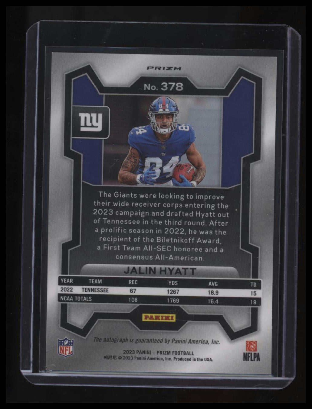 | *This is a Single Trading Card* | *Discounts are not available on Single Trading Cards* | This is a nice example of a 2023 Panini Prizm #378 Jalin Hyatt Rookie Autographs Prizm Pink AU. Please check out our other listings for more great cards. Thank you for your interest in one of our cards!!! Prior to making any bids/purchases, I would kindly ask you to read the information below: Item Condition Please see the provided pictures for the condition of the card or item, pictures of the front and back are provided for your review. We cannot accommodate requests for additional pictures. Any notable flaws or damage to this item will be noted in this listing. Please use the attached photos provided for your own assessment. Graded card cases may come with some minor wear/tear, surface scratch, chipped, or blemish. There are no partial refunds or returns because of the case condition. All single cards will come in protective cases. If you purchase a listing that's sold as a lot it may come in snap cases or sealed in a team bag, and not all cards will be individually sleeved and top loaded in all lots. Raw cards are sold as such, with no guarantees of potential and/or expected grades. All cards are sold as is, with no returns or refunds. Listed With Mascot.