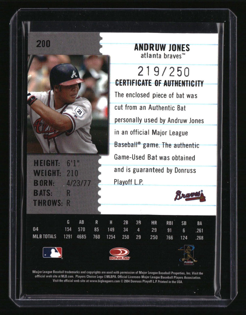 | *This is a Single Trading Card* | *Discounts are not available on Single Trading Cards* | This is a nice example of a 2005 Leaf Century #200 Andruw Jones Material Bat SN,MEMMEM: Bat;. Please check out our other listings for more great cards. Thank you for your interest in one of our cards!!! Prior to making any bids/purchases, I would kindly ask you to read the information below: Item Condition Please see the provided pictures for the condition of the card or item, pictures of the front and back are provided for your review. We cannot accommodate requests for additional pictures. Any notable flaws or damage to this item will be noted in this listing. Please use the attached photos provided for your own assessment. Graded card cases may come with some minor wear/tear, surface scratch, chipped, or blemish. There are no partial refunds or returns because of the case condition. All single cards will come in protective cases. If you purchase a listing that's sold as a lot it may come in snap cases or sealed in a team bag, and not all cards will be individually sleeved and top loaded in all lots. Raw cards are sold as such, with no guarantees of potential and/or expected grades. All cards are sold as is, with no returns or refunds. Listed With Mascot.