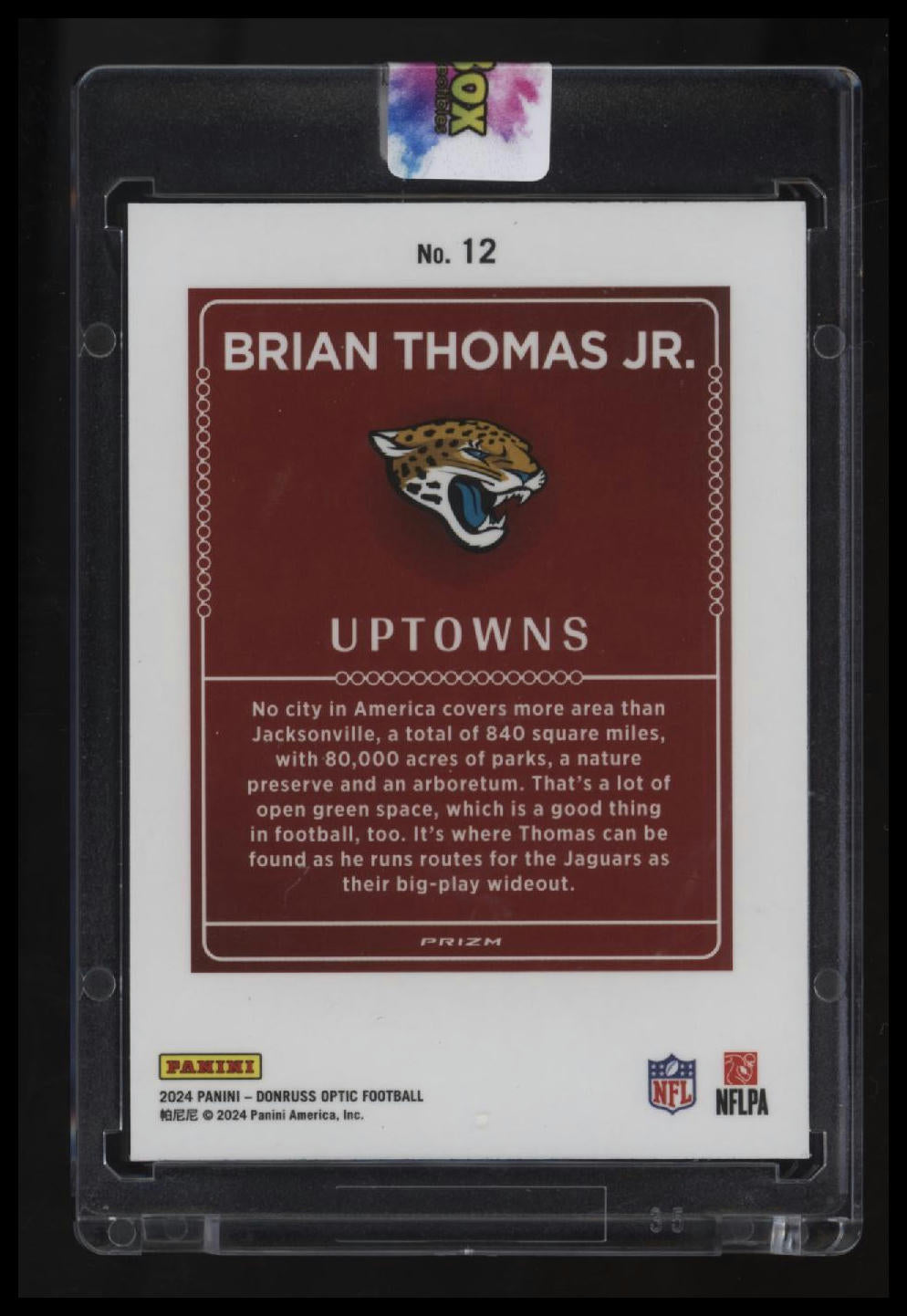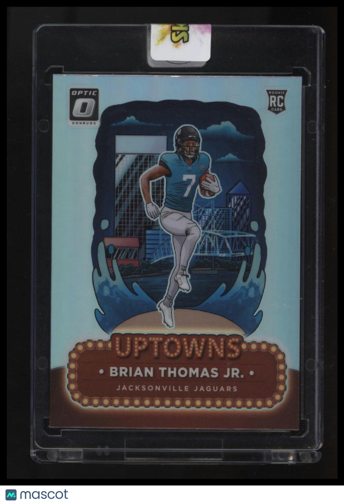 | *This is a Single Trading Card* | *Discounts are not available on Single Trading Cards* | This is a nice example of a 2024 Donruss Optic #12 Brian Thomas Jr. Uptowns . Please check out our other listings for more great cards. Thank you for your interest in one of our cards!!! Prior to making any bids/purchases, I would kindly ask you to read the information below: Item Condition Please see the provided pictures for the condition of the card or item, pictures of the front and back are provided for your review. We cannot accommodate requests for additional pictures. Any notable flaws or damage to this item will be noted in this listing. Please use the attached photos provided for your own assessment. Graded card cases may come with some minor wear/tear, surface scratch, chipped, or blemish. There are no partial refunds or returns because of the case condition. All single cards will come in protective cases. If you purchase a listing that's sold as a lot it may come in snap cases or sealed in a team bag, and not all cards will be individually sleeved and top loaded in all lots. Raw cards are sold as such, with no guarantees of potential and/or expected grades. All cards are sold as is, with no returns or refunds. Listed With Mascot.