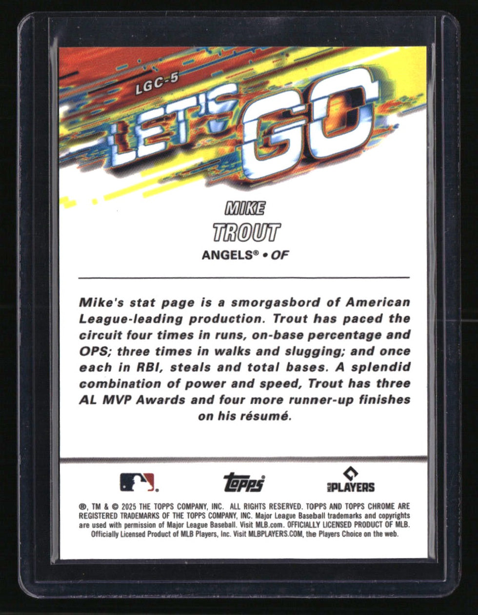 | *This is a Single Trading Card* | *Discounts are not available on Single Trading Cards* | This is a nice example of a 2025 Finest #LGC-5 Mike Trout Let's Go . Please check out our other listings for more great cards. Thank you for your interest in one of our cards!!! Prior to making any bids/purchases, I would kindly ask you to read the information below: Item Condition Please see the provided pictures for the condition of the card or item, pictures of the front and back are provided for your review. We cannot accommodate requests for additional pictures. Any notable flaws or damage to this item will be noted in this listing. Please use the attached photos provided for your own assessment. Graded card cases may come with some minor wear/tear, surface scratch, chipped, or blemish. There are no partial refunds or returns because of the case condition. All single cards will come in protective cases. If you purchase a listing that's sold as a lot it may come in snap cases or sealed in a team bag, and not all cards will be individually sleeved and top loaded in all lots. Raw cards are sold as such, with no guarantees of potential and/or expected grades. All cards are sold as is, with no returns or refunds. Listed With Mascot.