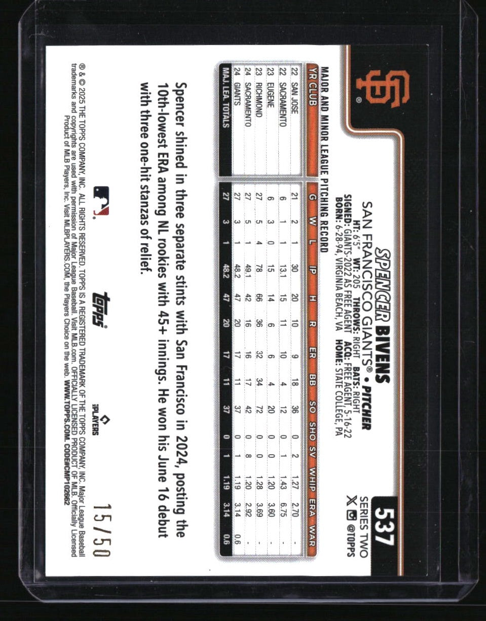 | *This is a Single Trading Card* | *Discounts are not available on Single Trading Cards* | This is a nice example of a 2025 Topps #537 Spencer Bivens Gold Rainbow Foil SN,RC. Please check out our other listings for more great cards. Thank you for your interest in one of our cards!!! Prior to making any bids/purchases, I would kindly ask you to read the information below: Item Condition Please see the provided pictures for the condition of the card or item, pictures of the front and back are provided for your review. We cannot accommodate requests for additional pictures. Any notable flaws or damage to this item will be noted in this listing. Please use the attached photos provided for your own assessment. Graded card cases may come with some minor wear/tear, surface scratch, chipped, or blemish. There are no partial refunds or returns because of the case condition. All single cards will come in protective cases. If you purchase a listing that's sold as a lot it may come in snap cases or sealed in a team bag, and not all cards will be individually sleeved and top loaded in all lots. Raw cards are sold as such, with no guarantees of potential and/or expected grades. All cards are sold as is, with no returns or refunds. Listed With Mascot.