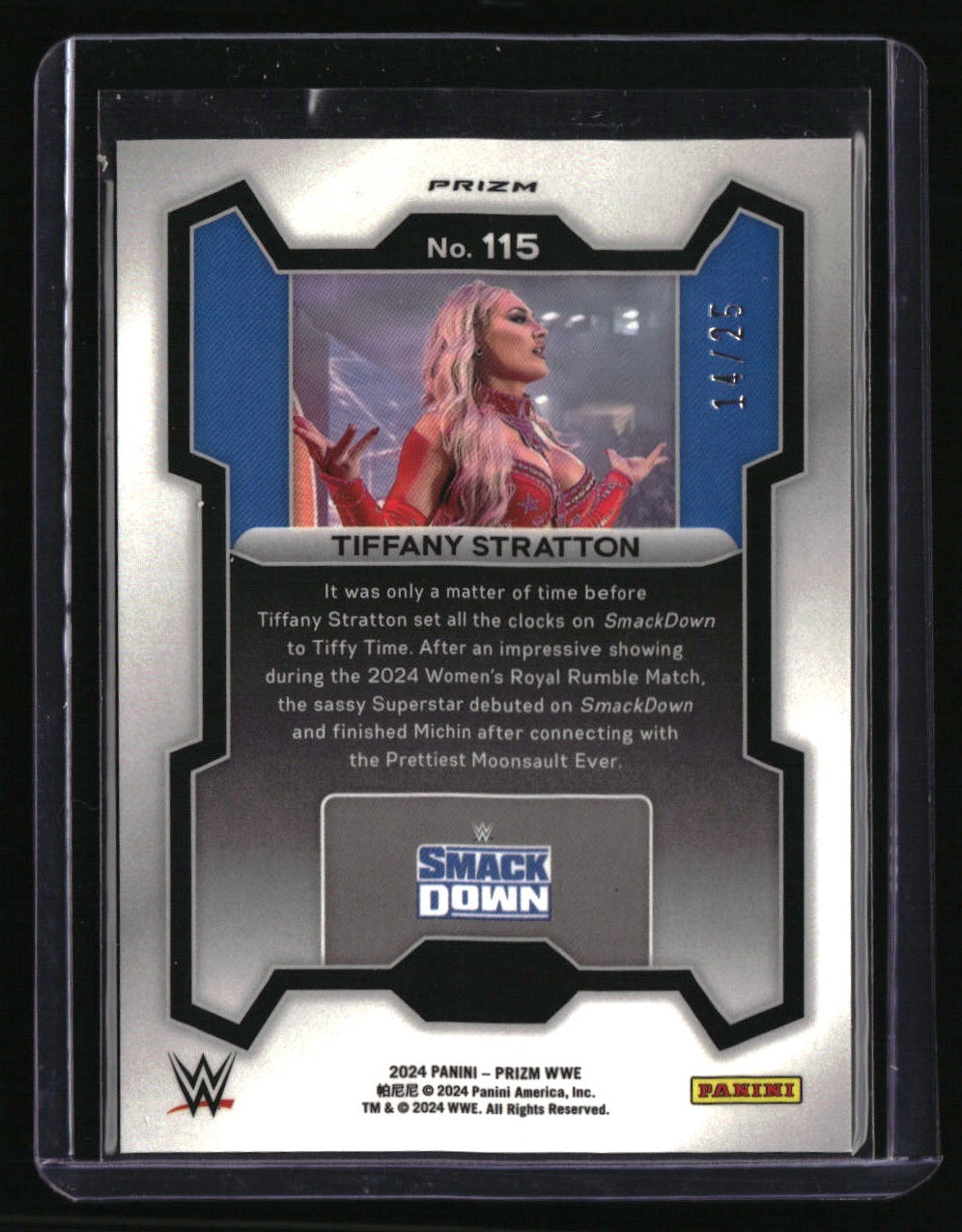 | *This is a Single Trading Card* | *Discounts are not available on Single Trading Cards* | This is a nice example of a 2024 Panini Prizm WWE #115 Tiffany Stratton Mojo Prizms SN. Please check out our other listings for more great cards. Thank you for your interest in one of our cards!!! Prior to making any bids/purchases, I would kindly ask you to read the information below: Item Condition Please see the provided pictures for the condition of the card or item, pictures of the front and back are provided for your review. We cannot accommodate requests for additional pictures. Any notable flaws or damage to this item will be noted in this listing. Please use the attached photos provided for your own assessment. Graded card cases may come with some minor wear/tear, surface scratch, chipped, or blemish. There are no partial refunds or returns because of the case condition. All single cards will come in protective cases. If you purchase a listing that's sold as a lot it may come in snap cases or sealed in a team bag, and not all cards will be individually sleeved and top loaded in all lots. Raw cards are sold as such, with no guarantees of potential and/or expected grades. All cards are sold as is, with no returns or refunds. Listed With Mascot.