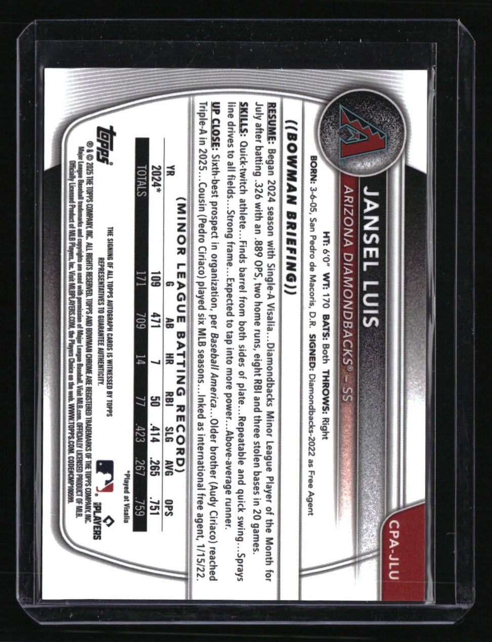 | *This is a Single Trading Card* | *Discounts are not available on Single Trading Cards* | This is a nice example of a 2025 Bowman #CPA-JLU Jansel Luis Chrome Prospect Autographs AU. Please check out our other listings for more great cards. Thank you for your interest in one of our cards!!! Prior to making any bids/purchases, I would kindly ask you to read the information below: Item Condition Please see the provided pictures for the condition of the card or item, pictures of the front and back are provided for your review. We cannot accommodate requests for additional pictures. Any notable flaws or damage to this item will be noted in this listing. Please use the attached photos provided for your own assessment. Graded card cases may come with some minor wear/tear, surface scratch, chipped, or blemish. There are no partial refunds or returns because of the case condition. All single cards will come in protective cases. If you purchase a listing that's sold as a lot it may come in snap cases or sealed in a team bag, and not all cards will be individually sleeved and top loaded in all lots. Raw cards are sold as such, with no guarantees of potential and/or expected grades. All cards are sold as is, with no returns or refunds. Listed With Mascot.