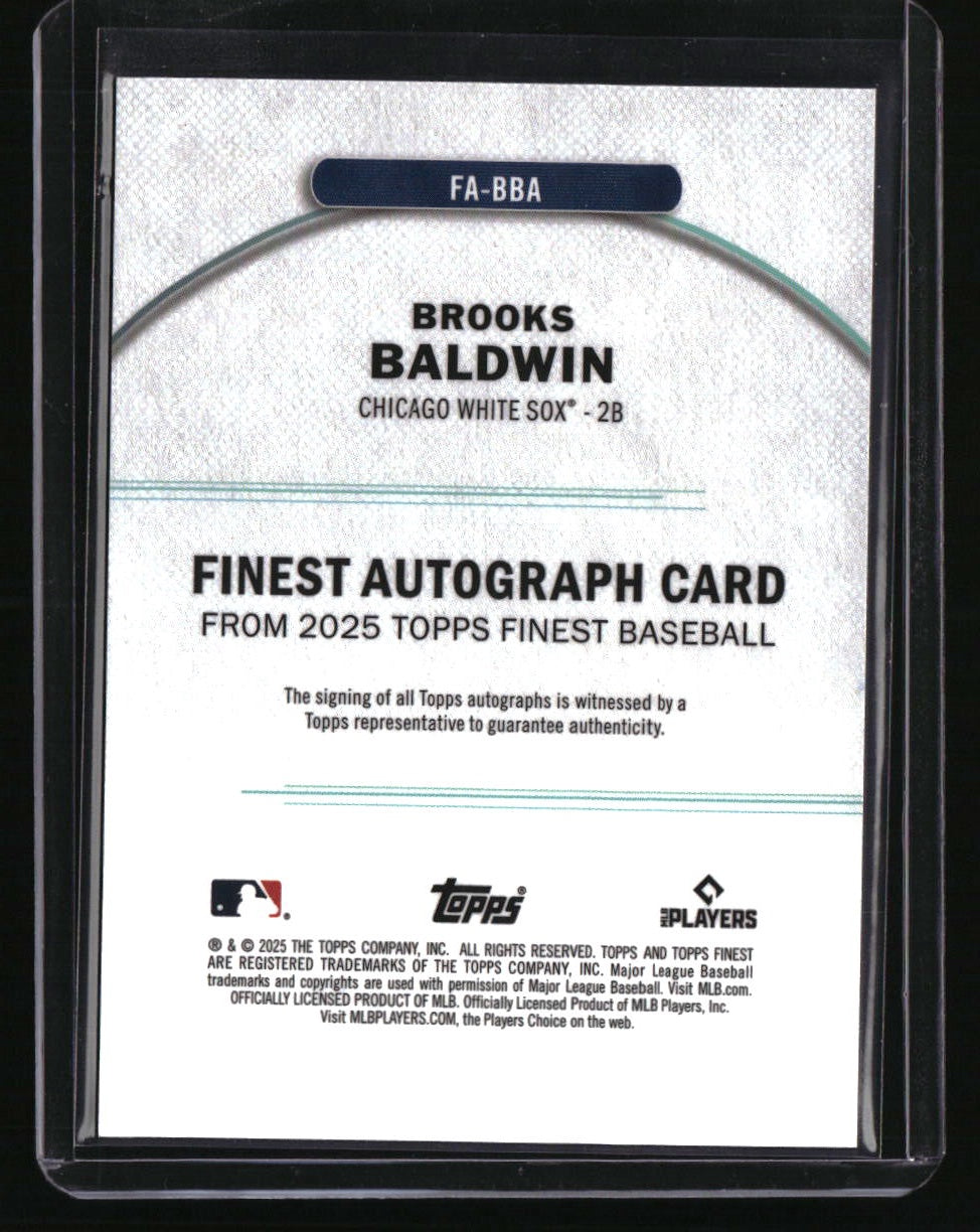 | *This is a Single Trading Card* | *Discounts are not available on Single Trading Cards* | This is a nice example of a 2025 Finest #FA-BBA Brooks Baldwin Finest Autographs Blue SN,AU. Please check out our other listings for more great cards. Thank you for your interest in one of our cards!!! Prior to making any bids/purchases, I would kindly ask you to read the information below: Item Condition Please see the provided pictures for the condition of the card or item, pictures of the front and back are provided for your review. We cannot accommodate requests for additional pictures. Any notable flaws or damage to this item will be noted in this listing. Please use the attached photos provided for your own assessment. Graded card cases may come with some minor wear/tear, surface scratch, chipped, or blemish. There are no partial refunds or returns because of the case condition. All single cards will come in protective cases. If you purchase a listing that's sold as a lot it may come in snap cases or sealed in a team bag, and not all cards will be individually sleeved and top loaded in all lots. Raw cards are sold as such, with no guarantees of potential and/or expected grades. All cards are sold as is, with no returns or refunds. Listed With Mascot.