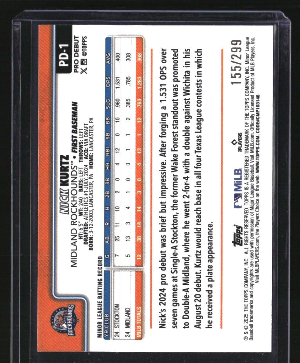 | *This is a Single Trading Card* | *Discounts are not available on Single Trading Cards* | This is a nice example of a 2025 Topps Pro Debut #PD-1 Nick Kurtz Purple Foil SN. Please check out our other listings for more great cards. Thank you for your interest in one of our cards!!! Prior to making any bids/purchases, I would kindly ask you to read the information below: Item Condition Please see the provided pictures for the condition of the card or item, pictures of the front and back are provided for your review. We cannot accommodate requests for additional pictures. Any notable flaws or damage to this item will be noted in this listing. Please use the attached photos provided for your own assessment. Graded card cases may come with some minor wear/tear, surface scratch, chipped, or blemish. There are no partial refunds or returns because of the case condition. All single cards will come in protective cases. If you purchase a listing that's sold as a lot it may come in snap cases or sealed in a team bag, and not all cards will be individually sleeved and top loaded in all lots. Raw cards are sold as such, with no guarantees of potential and/or expected grades. All cards are sold as is, with no returns or refunds. Listed With Mascot.