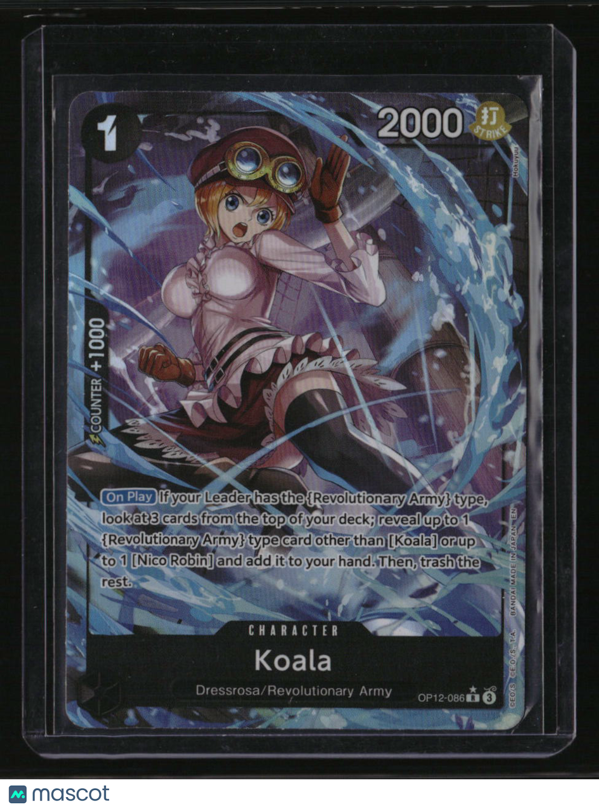 | *This is a Single Trading Card* | *Discounts are not available on Single Trading Cards* | This is a nice example of a Legacy of the Master #OP12-086 Koala (086) (Alternate Art) Rare. Please check out our other listings for more great cards. Thank you for your interest in one of our cards!!! Prior to making any bids/purchases, I would kindly ask you to read the information below: Item Condition Please see the provided pictures for the condition of the card or item, pictures of the front and back are provided for your review. We cannot accommodate requests for additional pictures. Any notable flaws or damage to this item will be noted in this listing. Please use the attached photos provided for your own assessment. Graded card cases may come with some minor wear/tear, surface scratch, chipped, or blemish. There are no partial refunds or returns because of the case condition. All single cards will come in protective cases. If you purchase a listing that's sold as a lot it may come in snap cases or sealed in a team bag, and not all cards will be individually sleeved and top loaded in all lots. Raw cards are sold as such, with no guarantees of potential and/or expected grades. All cards are sold as is, with no returns or refunds. Listed With Mascot.