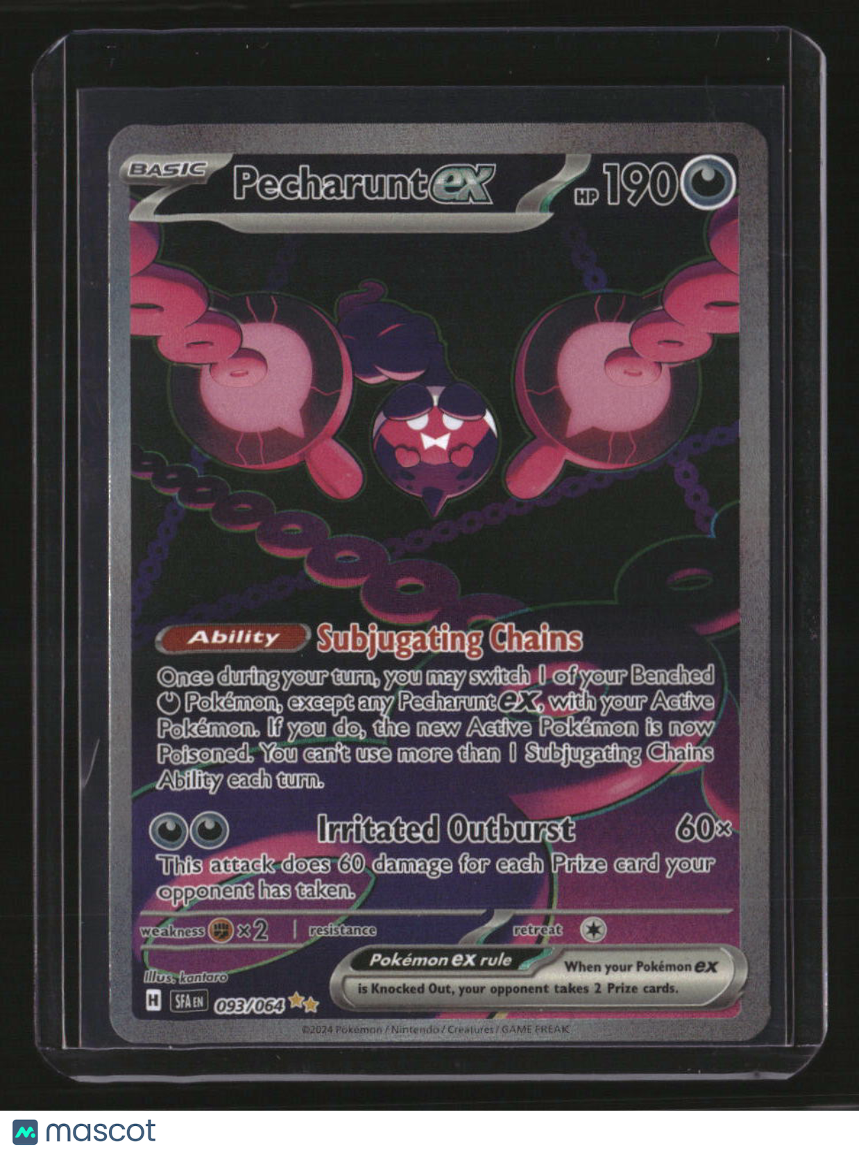 | *This is a Single Trading Card* | *Discounts are not available on Single Trading Cards* | This is a nice example of a SV: Shrouded Fable #093/064 Pecharunt ex . Please check out our other listings for more great cards. Thank you for your interest in one of our cards!!! Prior to making any bids/purchases, I would kindly ask you to read the information below: Item Condition Please see the provided pictures for the condition of the card or item, pictures of the front and back are provided for your review. We cannot accommodate requests for additional pictures. Any notable flaws or damage to this item will be noted in this listing. Please use the attached photos provided for your own assessment. Graded card cases may come with some minor wear/tear, surface scratch, chipped, or blemish. There are no partial refunds or returns because of the case condition. All single cards will come in protective cases. If you purchase a listing that's sold as a lot it may come in snap cases or sealed in a team bag, and not all cards will be individually sleeved and top loaded in all lots. Raw cards are sold as such, with no guarantees of potential and/or expected grades. All cards are sold as is, with no returns or refunds. Listed With Mascot.