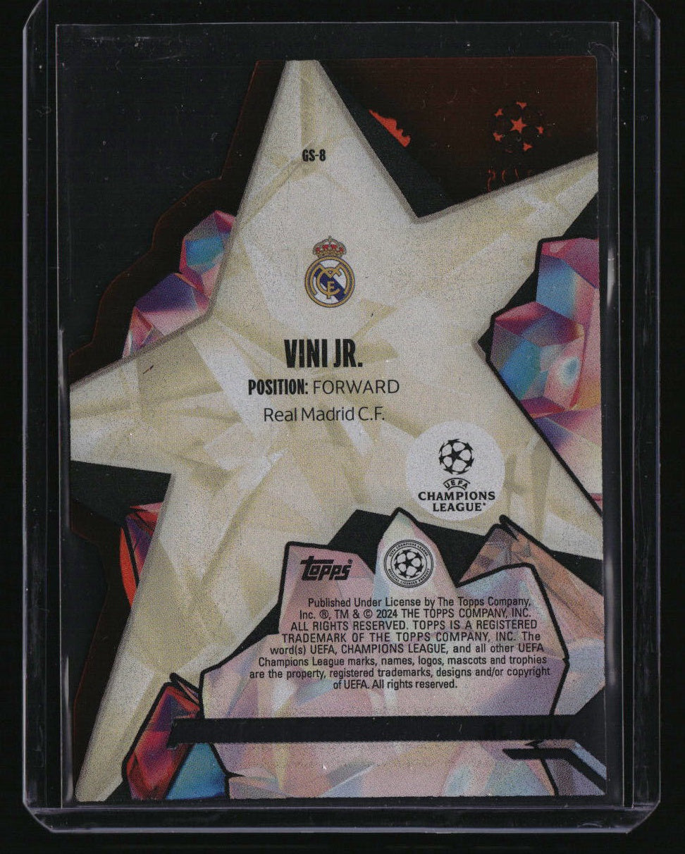 | *This is a Single Trading Card* | *Discounts are not available on Single Trading Cards* | This is a nice example of a 2023-24 Topps Crystal Premium UEFA Champions League #GS-8 Vini Jr. Gold Star Die-Cut Orange SN. Please check out our other listings for more great cards. Thank you for your interest in one of our cards!!! Prior to making any bids/purchases, I would kindly ask you to read the information below: Item Condition Please see the provided pictures for the condition of the card or item, pictures of the front and back are provided for your review. We cannot accommodate requests for additional pictures. Any notable flaws or damage to this item will be noted in this listing. Please use the attached photos provided for your own assessment. Graded card cases may come with some minor wear/tear, surface scratch, chipped, or blemish. There are no partial refunds or returns because of the case condition. All single cards will come in protective cases. If you purchase a listing that's sold as a lot it may come in snap cases or sealed in a team bag, and not all cards will be individually sleeved and top loaded in all lots. Raw cards are sold as such, with no guarantees of potential and/or expected grades. All cards are sold as is, with no returns or refunds. Listed With Mascot.