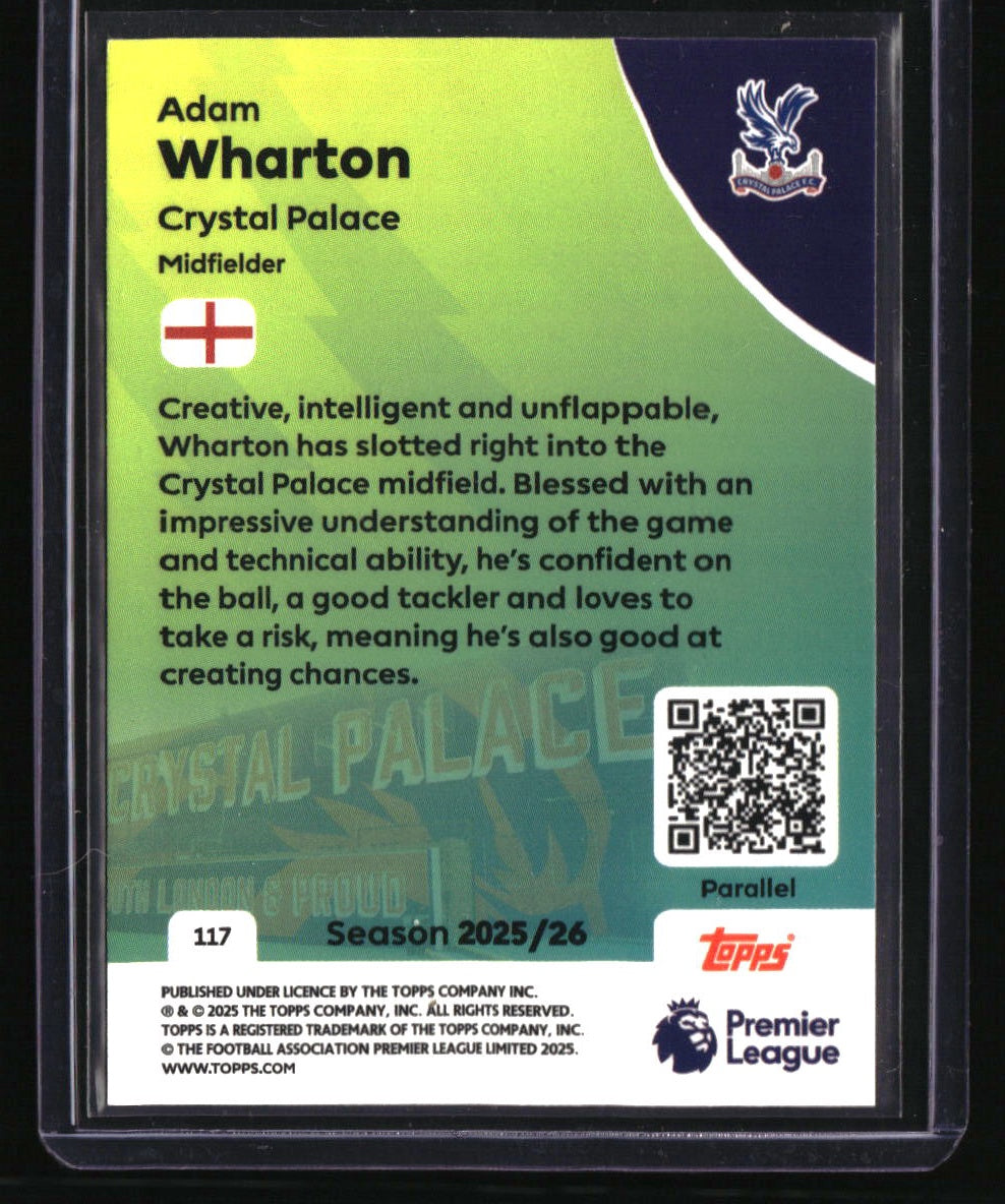 | *This is a Single Trading Card* | *Discounts are not available on Single Trading Cards* | This is a nice example of a 2025-26 Topps Premier League #117 Adam Wharton Orange Rainbow Foil SN. Please check out our other listings for more great cards. Thank you for your interest in one of our cards!!! Prior to making any bids/purchases, I would kindly ask you to read the information below: Item Condition Please see the provided pictures for the condition of the card or item, pictures of the front and back are provided for your review. We cannot accommodate requests for additional pictures. Any notable flaws or damage to this item will be noted in this listing. Please use the attached photos provided for your own assessment. Graded card cases may come with some minor wear/tear, surface scratch, chipped, or blemish. There are no partial refunds or returns because of the case condition. All single cards will come in protective cases. If you purchase a listing that's sold as a lot it may come in snap cases or sealed in a team bag, and not all cards will be individually sleeved and top loaded in all lots. Raw cards are sold as such, with no guarantees of potential and/or expected grades. All cards are sold as is, with no returns or refunds. Listed With Mascot.