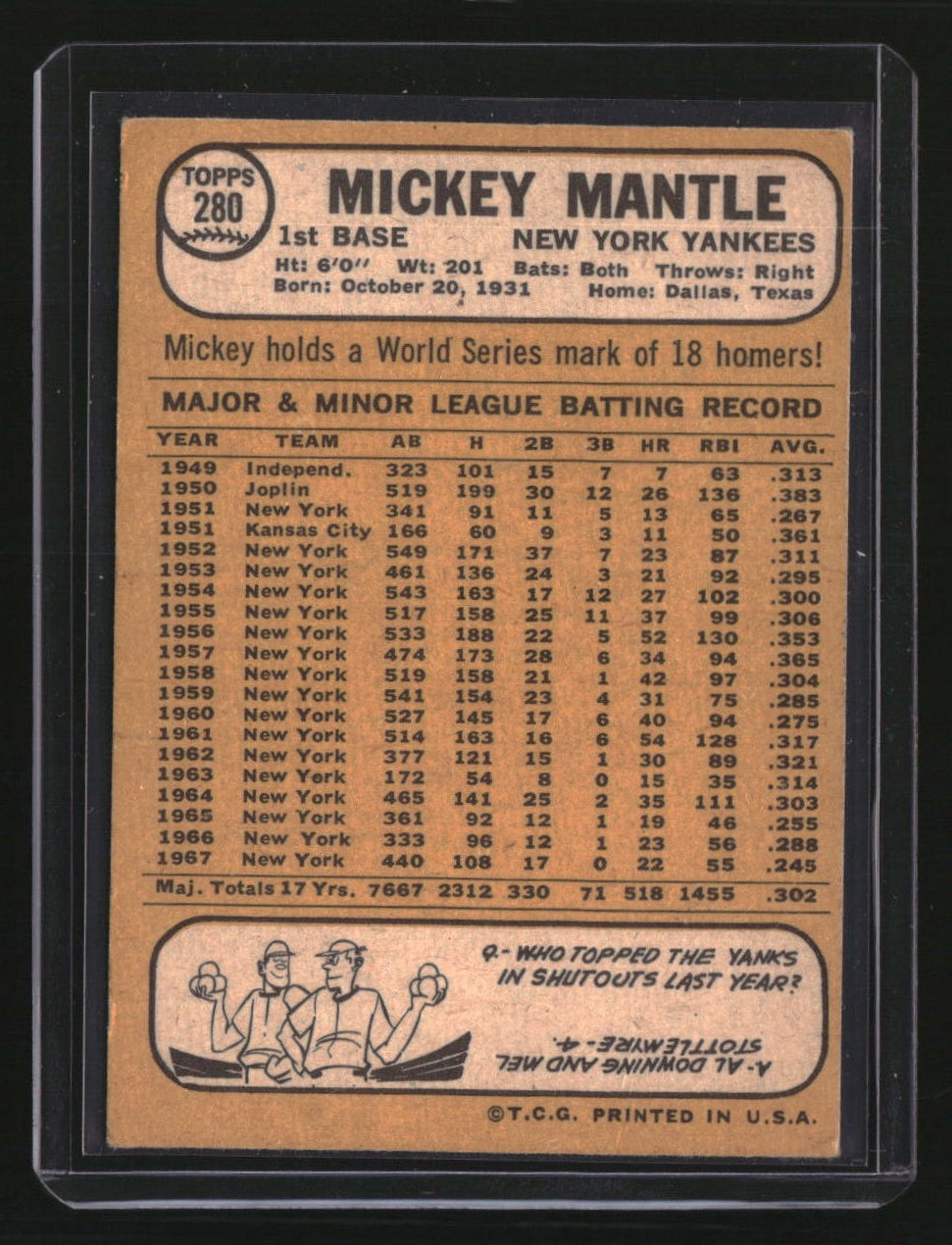 | *This is a Single Trading Card* | *Discounts are not available on Single Trading Cards* | This is a nice example of a 1968 Topps #280 Mickey Mantle . Please check out our other listings for more great cards. Thank you for your interest in one of our cards!!! Prior to making any bids/purchases, I would kindly ask you to read the information below: Item Condition Please see the provided pictures for the condition of the card or item, pictures of the front and back are provided for your review. We cannot accommodate requests for additional pictures. Any notable flaws or damage to this item will be noted in this listing. Please use the attached photos provided for your own assessment. Graded card cases may come with some minor wear/tear, surface scratch, chipped, or blemish. There are no partial refunds or returns because of the case condition. All single cards will come in protective cases. If you purchase a listing that's sold as a lot it may come in snap cases or sealed in a team bag, and not all cards will be individually sleeved and top loaded in all lots. Raw cards are sold as such, with no guarantees of potential and/or expected grades. All cards are sold as is, with no returns or refunds. Listed With Mascot.