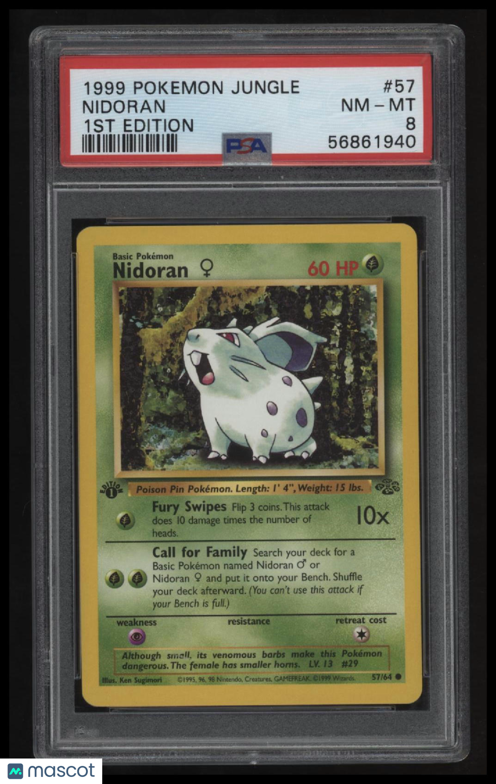 | *This is a Single Trading Card* | *Discounts are not available on Single Trading Cards* | This is a nice example of a 1999 Pokemon Jungle #57 Nidoran 1st Edition PSA 8 NM-MT. Please check out our other listings for more great cards. Thank you for your interest in one of our cards!!! Prior to making any bids/purchases, I would kindly ask you to read the information below: Item Condition Please see the provided pictures for the condition of the card or item, pictures of the front and back are provided for your review. We cannot accommodate requests for additional pictures. Any notable flaws or damage to this item will be noted in this listing. Please use the attached photos provided for your own assessment. Graded card cases may come with some minor wear/tear, surface scratch, chipped, or blemish. There are no partial refunds or returns because of the case condition. All single cards will come in protective cases. If you purchase a listing that's sold as a lot it may come in snap cases or sealed in a team bag, and not all cards will be individually sleeved and top loaded in all lots. Raw cards are sold as such, with no guarantees of potential and/or expected grades. All cards are sold as is, with no returns or refunds. Listed With Mascot.