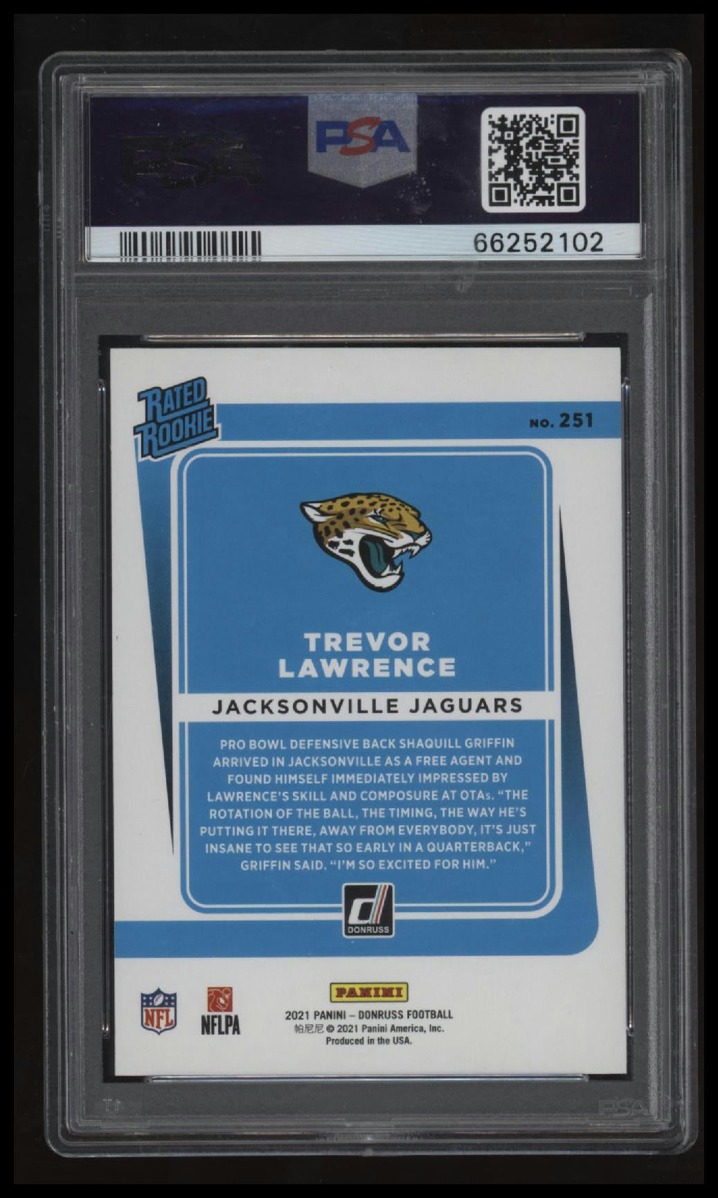| *This is a Single Trading Card* | *Discounts are not available on Single Trading Cards* | This is a nice example of a 2021 Panini Donruss #251 Trevor Lawrence PSA 9 MINT. Please check out our other listings for more great cards. Thank you for your interest in one of our cards!!! Prior to making any bids/purchases, I would kindly ask you to read the information below: Item Condition Please see the provided pictures for the condition of the card or item, pictures of the front and back are provided for your review. We cannot accommodate requests for additional pictures. Any notable flaws or damage to this item will be noted in this listing. Please use the attached photos provided for your own assessment. Graded card cases may come with some minor wear/tear, surface scratch, chipped, or blemish. There are no partial refunds or returns because of the case condition. All single cards will come in protective cases. If you purchase a listing that's sold as a lot it may come in snap cases or sealed in a team bag, and not all cards will be individually sleeved and top loaded in all lots. Raw cards are sold as such, with no guarantees of potential and/or expected grades. All cards are sold as is, with no returns or refunds. Listed With Mascot.