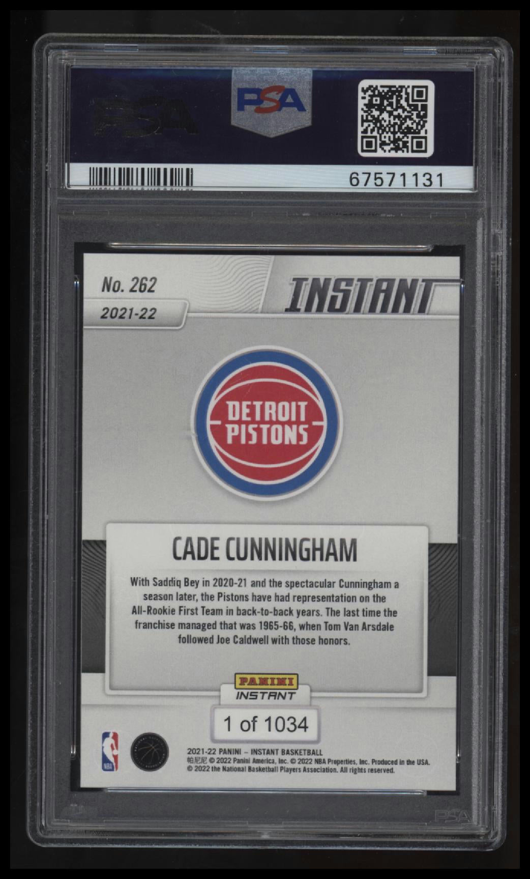 | *This is a Single Trading Card* | *Discounts are not available on Single Trading Cards* | This is a nice example of a 2021 Panini Instant #262 Cade Cunningham PSA 10 GEM MT. Please check out our other listings for more great cards. Thank you for your interest in one of our cards!!! Prior to making any bids/purchases, I would kindly ask you to read the information below: Item Condition Please see the provided pictures for the condition of the card or item, pictures of the front and back are provided for your review. We cannot accommodate requests for additional pictures. Any notable flaws or damage to this item will be noted in this listing. Please use the attached photos provided for your own assessment. Graded card cases may come with some minor wear/tear, surface scratch, chipped, or blemish. There are no partial refunds or returns because of the case condition. All single cards will come in protective cases. If you purchase a listing that's sold as a lot it may come in snap cases or sealed in a team bag, and not all cards will be individually sleeved and top loaded in all lots. Raw cards are sold as such, with no guarantees of potential and/or expected grades. All cards are sold as is, with no returns or refunds. Listed With Mascot.