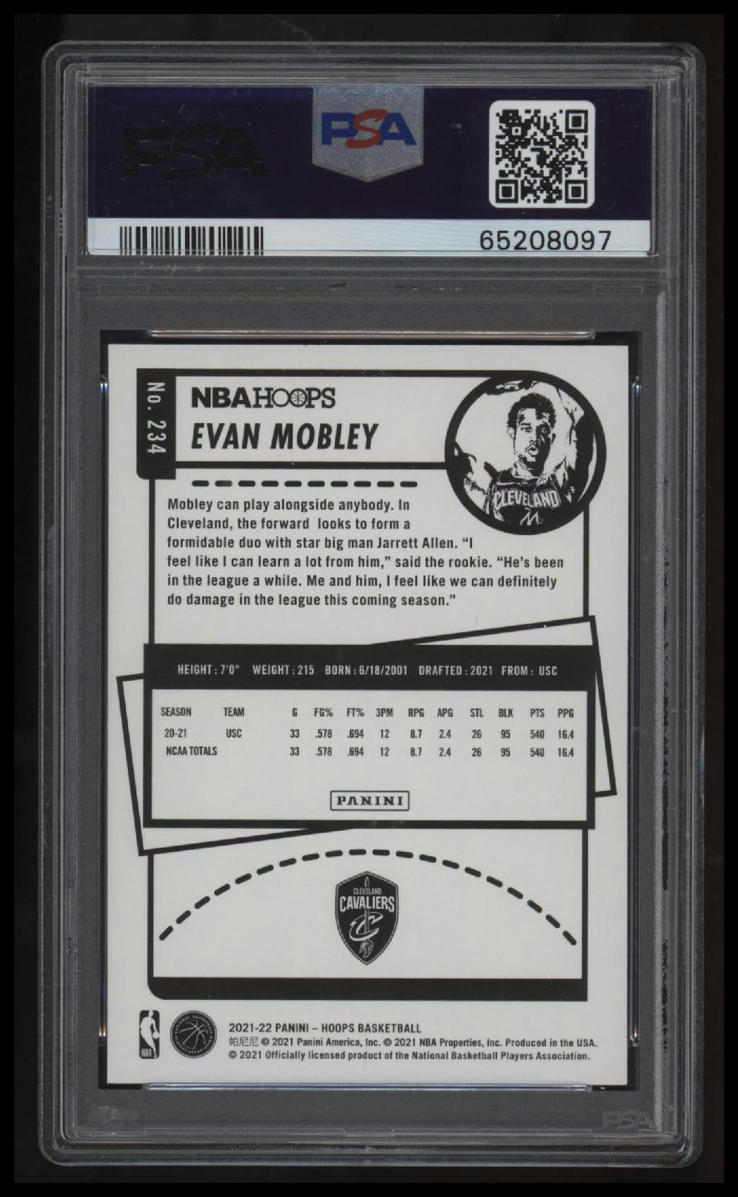 | *This is a Single Trading Card* | *Discounts are not available on Single Trading Cards* | This is a nice example of a 2021 Panini NBA Hoops #234 Evan Mobley PSA 10 GEM MT. Please check out our other listings for more great cards. Thank you for your interest in one of our cards!!! Prior to making any bids/purchases, I would kindly ask you to read the information below: Item Condition Please see the provided pictures for the condition of the card or item, pictures of the front and back are provided for your review. We cannot accommodate requests for additional pictures. Any notable flaws or damage to this item will be noted in this listing. Please use the attached photos provided for your own assessment. Graded card cases may come with some minor wear/tear, surface scratch, chipped, or blemish. There are no partial refunds or returns because of the case condition. All single cards will come in protective cases. If you purchase a listing that's sold as a lot it may come in snap cases or sealed in a team bag, and not all cards will be individually sleeved and top loaded in all lots. Raw cards are sold as such, with no guarantees of potential and/or expected grades. All cards are sold as is, with no returns or refunds. Listed With Mascot.