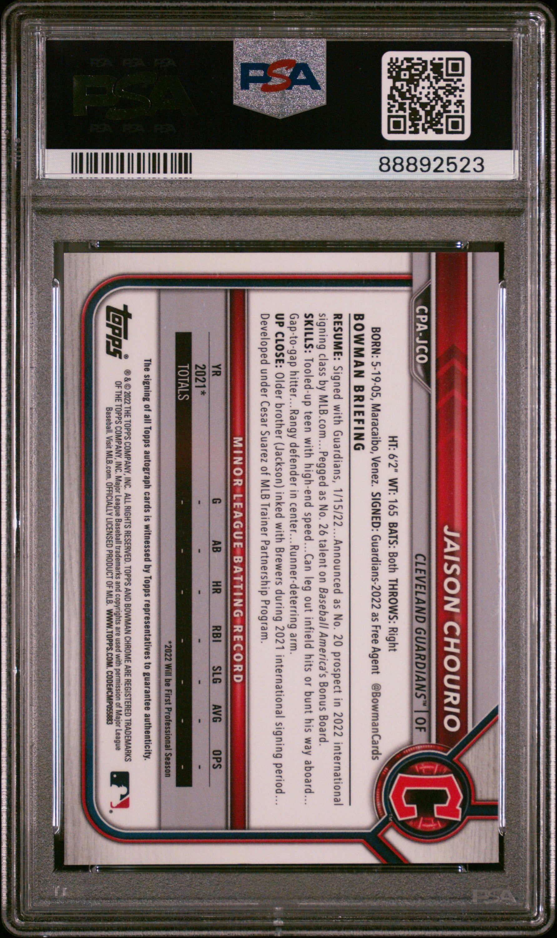 | *This is a Single Trading Card* | *Discounts are not available on Single Trading Cards* | This is a nice example of a 2022 Bowman Chrome Prospect Autographs #CPAJCO Jaison Chourio Prs.Au-Speckle Refractor PSA 10 GEM MT. Please check out our other listings for more great cards. Thank you for your interest in one of our cards!!! Prior to making any bids/purchases, I would kindly ask you to read the information below: Item Condition Please see the provided pictures for the condition of the card or item, pictures of the front and back are provided for your review. We cannot accommodate requests for additional pictures. Any notable flaws or damage to this item will be noted in this listing. Please use the attached photos provided for your own assessment. Graded card cases may come with some minor wear/tear, surface scratch, chipped, or blemish. There are no partial refunds or returns because of the case condition. All single cards will come in protective cases. If you purchase a listing that's sold as a lot it may come in snap cases or sealed in a team bag, and not all cards will be individually sleeved and top loaded in all lots. Raw cards are sold as such, with no guarantees of potential and/or expected grades. All cards are sold as is, with no returns or refunds. Listed With Mascot.