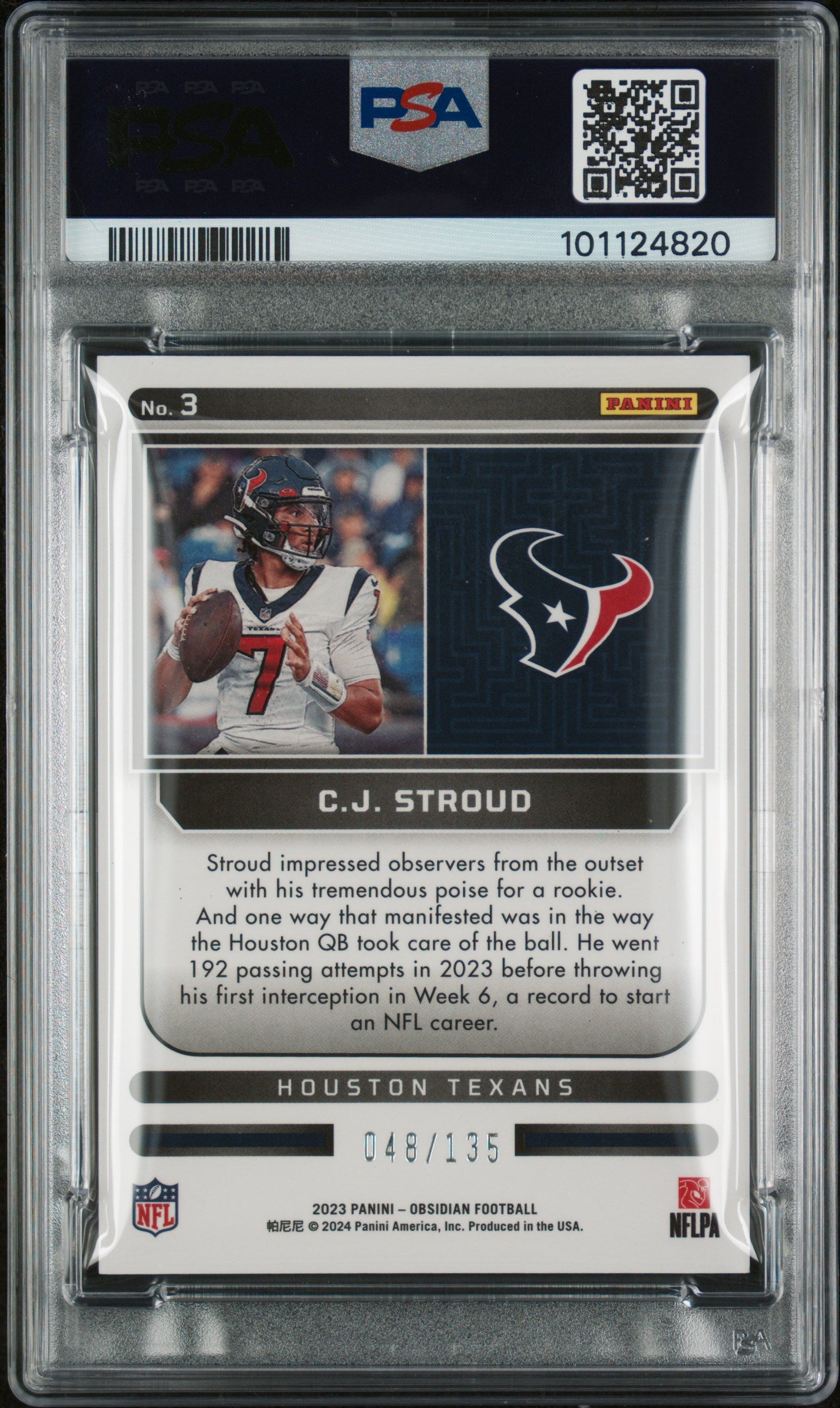 | *This is a Single Trading Card* | *Discounts are not available on Single Trading Cards* | This is a nice example of a 2023 Panini Obsidian Supernova #3 Cj Stroud PSA 10 GEM MT. Please check out our other listings for more great cards. Thank you for your interest in one of our cards!!! Prior to making any bids/purchases, I would kindly ask you to read the information below: Item Condition Please see the provided pictures for the condition of the card or item, pictures of the front and back are provided for your review. We cannot accommodate requests for additional pictures. Any notable flaws or damage to this item will be noted in this listing. Please use the attached photos provided for your own assessment. Graded card cases may come with some minor wear/tear, surface scratch, chipped, or blemish. There are no partial refunds or returns because of the case condition. All single cards will come in protective cases. If you purchase a listing that's sold as a lot it may come in snap cases or sealed in a team bag, and not all cards will be individually sleeved and top loaded in all lots. Raw cards are sold as such, with no guarantees of potential and/or expected grades. All cards are sold as is, with no returns or refunds. Listed With Mascot.