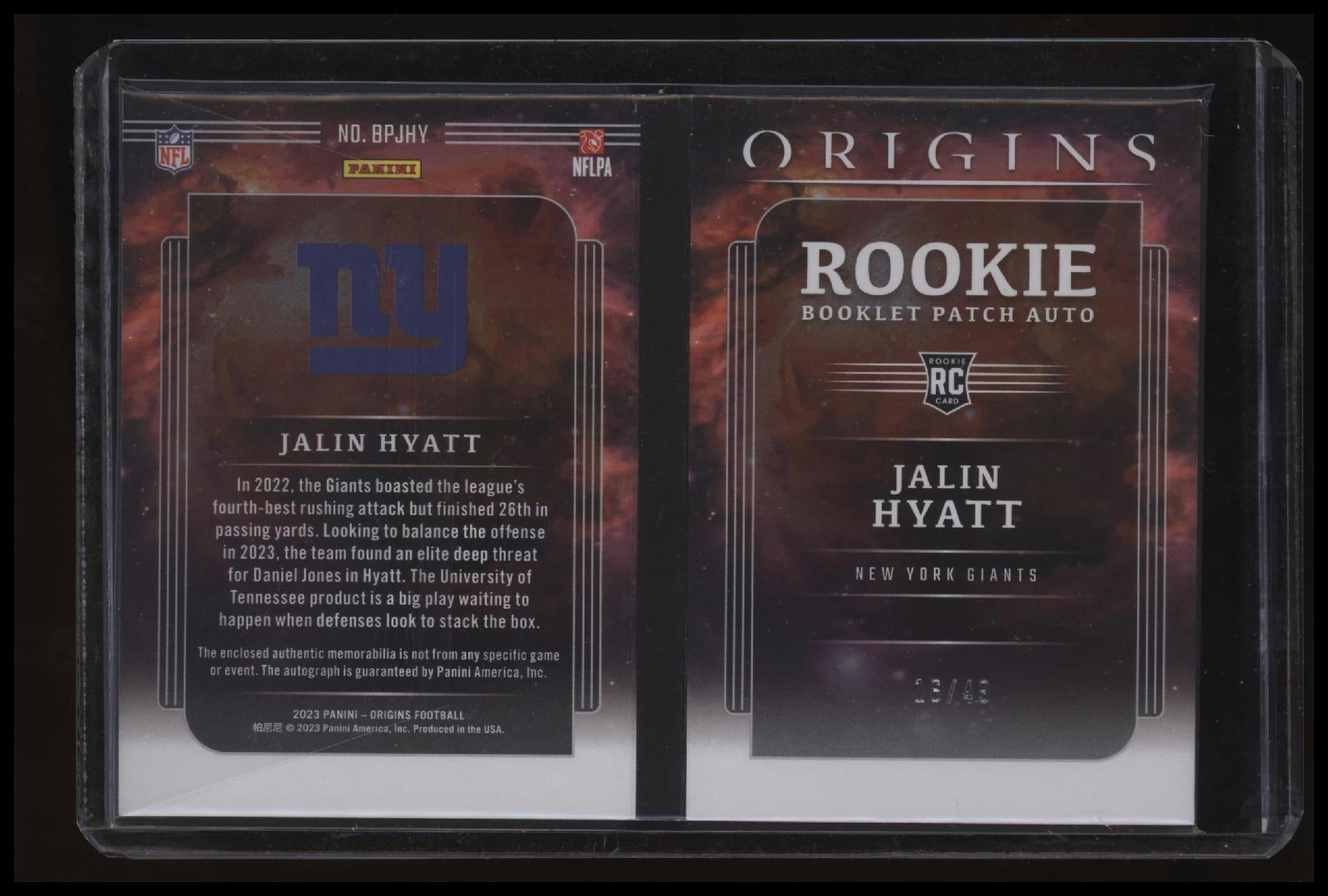 | *This is a Single Trading Card* | *Discounts are not available on Single Trading Cards* | This is a nice example of a 2023 Panini Origins #BPJHY Jalin Hyatt Rookie Booklet Patch Auto SN,MEM,AU. Please check out our other listings for more great cards. Thank you for your interest in one of our cards!!! Prior to making any bids/purchases, I would kindly ask you to read the information below: Item Condition Please see the provided pictures for the condition of the card or item, pictures of the front and back are provided for your review. We cannot accommodate requests for additional pictures. Any notable flaws or damage to this item will be noted in this listing. Please use the attached photos provided for your own assessment. Graded card cases may come with some minor wear/tear, surface scratch, chipped, or blemish. There are no partial refunds or returns because of the case condition. All single cards will come in protective cases. If you purchase a listing that's sold as a lot it may come in snap cases or sealed in a team bag, and not all cards will be individually sleeved and top loaded in all lots. Raw cards are sold as such, with no guarantees of potential and/or expected grades. All cards are sold as is, with no returns or refunds. Listed With Mascot.