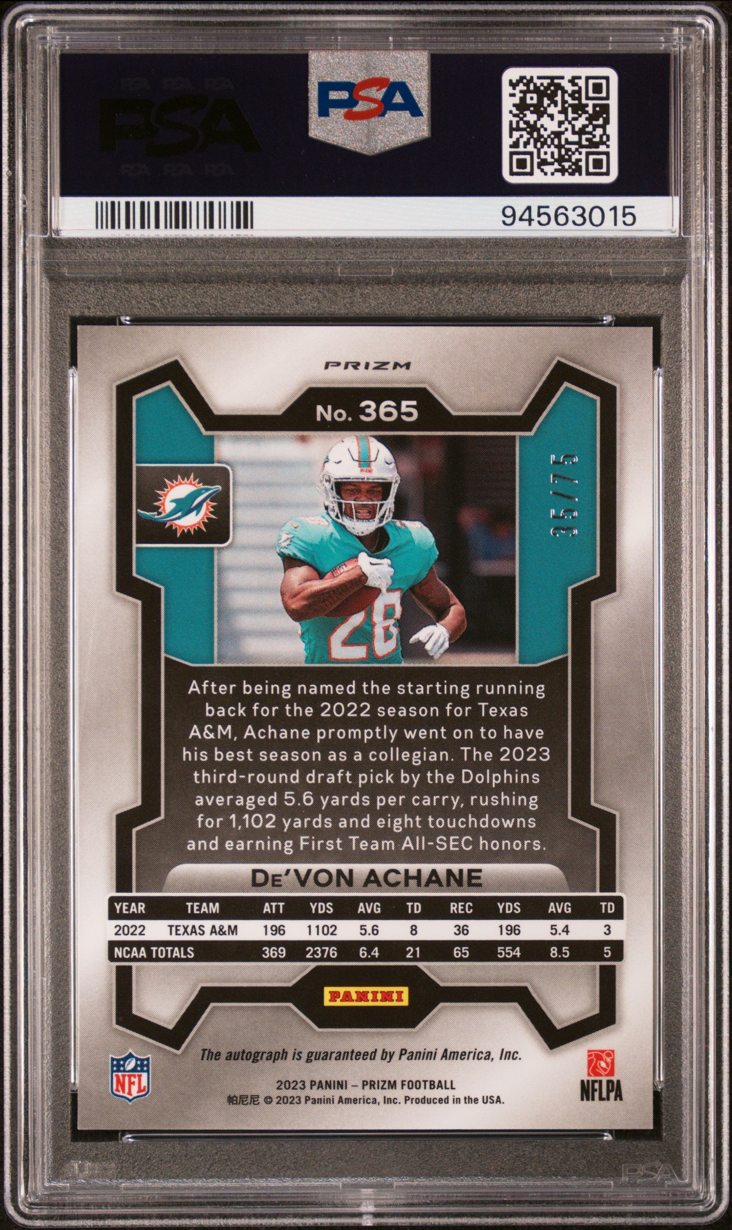 | *This is a Single Trading Card* | *Discounts are not available on Single Trading Cards* | This is a nice example of a 2023 Panini Prizm #365 De'Von Achane Autograph-Green Scope PSA 9 MINT. Please check out our other listings for more great cards. Thank you for your interest in one of our cards!!! Prior to making any bids/purchases, I would kindly ask you to read the information below: Item Condition Please see the provided pictures for the condition of the card or item, pictures of the front and back are provided for your review. We cannot accommodate requests for additional pictures. Any notable flaws or damage to this item will be noted in this listing. Please use the attached photos provided for your own assessment. Graded card cases may come with some minor wear/tear, surface scratch, chipped, or blemish. There are no partial refunds or returns because of the case condition. All single cards will come in protective cases. If you purchase a listing that's sold as a lot it may come in snap cases or sealed in a team bag, and not all cards will be individually sleeved and top loaded in all lots. Raw cards are sold as such, with no guarantees of potential and/or expected grades. All cards are sold as is, with no returns or refunds. Listed With Mascot.