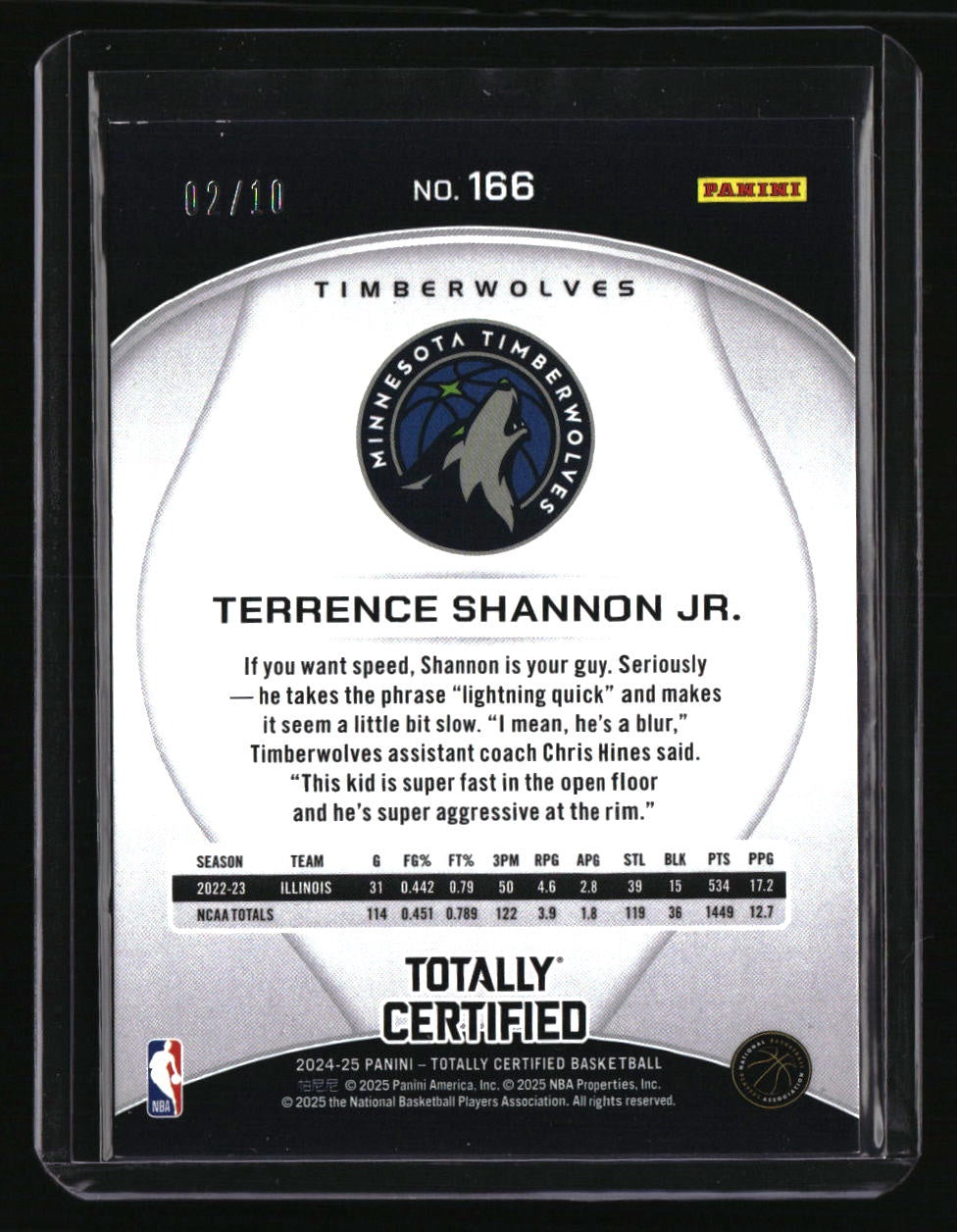| *This is a Single Trading Card* | *Discounts are not available on Single Trading Cards* | This is a nice example of a 2024-25 Panini Totally Certified #166 Terrence Shannon Jr. Mirror Gold SN,RC. Please check out our other listings for more great cards. Thank you for your interest in one of our cards!!! Prior to making any bids/purchases, I would kindly ask you to read the information below: Item Condition Please see the provided pictures for the condition of the card or item, pictures of the front and back are provided for your review. We cannot accommodate requests for additional pictures. Any notable flaws or damage to this item will be noted in this listing. Please use the attached photos provided for your own assessment. Graded card cases may come with some minor wear/tear, surface scratch, chipped, or blemish. There are no partial refunds or returns because of the case condition. All single cards will come in protective cases. If you purchase a listing that's sold as a lot it may come in snap cases or sealed in a team bag, and not all cards will be individually sleeved and top loaded in all lots. Raw cards are sold as such, with no guarantees of potential and/or expected grades. All cards are sold as is, with no returns or refunds. Listed With Mascot.
