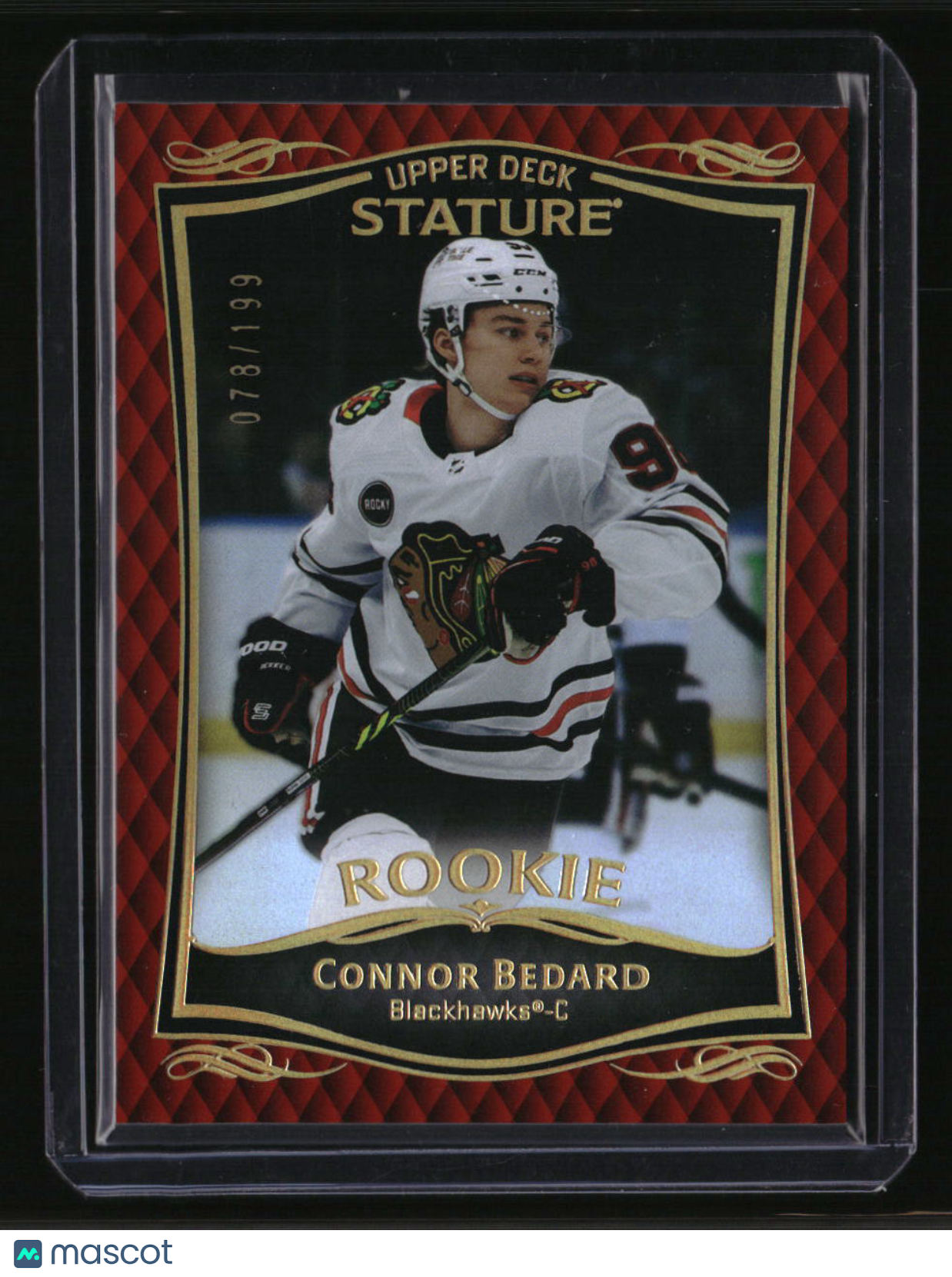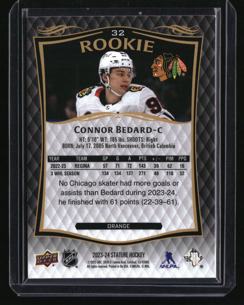 | *This is a Single Trading Card* | *Discounts are not available on Single Trading Cards* | This is a nice example of a 2024-25 Upper Deck Stature #32 Connor Bedard 2023-24 Update - Orange SN. Please check out our other listings for more great cards. Thank you for your interest in one of our cards!!! Prior to making any bids/purchases, I would kindly ask you to read the information below: Item Condition Please see the provided pictures for the condition of the card or item, pictures of the front and back are provided for your review. We cannot accommodate requests for additional pictures. Any notable flaws or damage to this item will be noted in this listing. Please use the attached photos provided for your own assessment. Graded card cases may come with some minor wear/tear, surface scratch, chipped, or blemish. There are no partial refunds or returns because of the case condition. All single cards will come in protective cases. If you purchase a listing that's sold as a lot it may come in snap cases or sealed in a team bag, and not all cards will be individually sleeved and top loaded in all lots. Raw cards are sold as such, with no guarantees of potential and/or expected grades. All cards are sold as is, with no returns or refunds. Listed With Mascot.