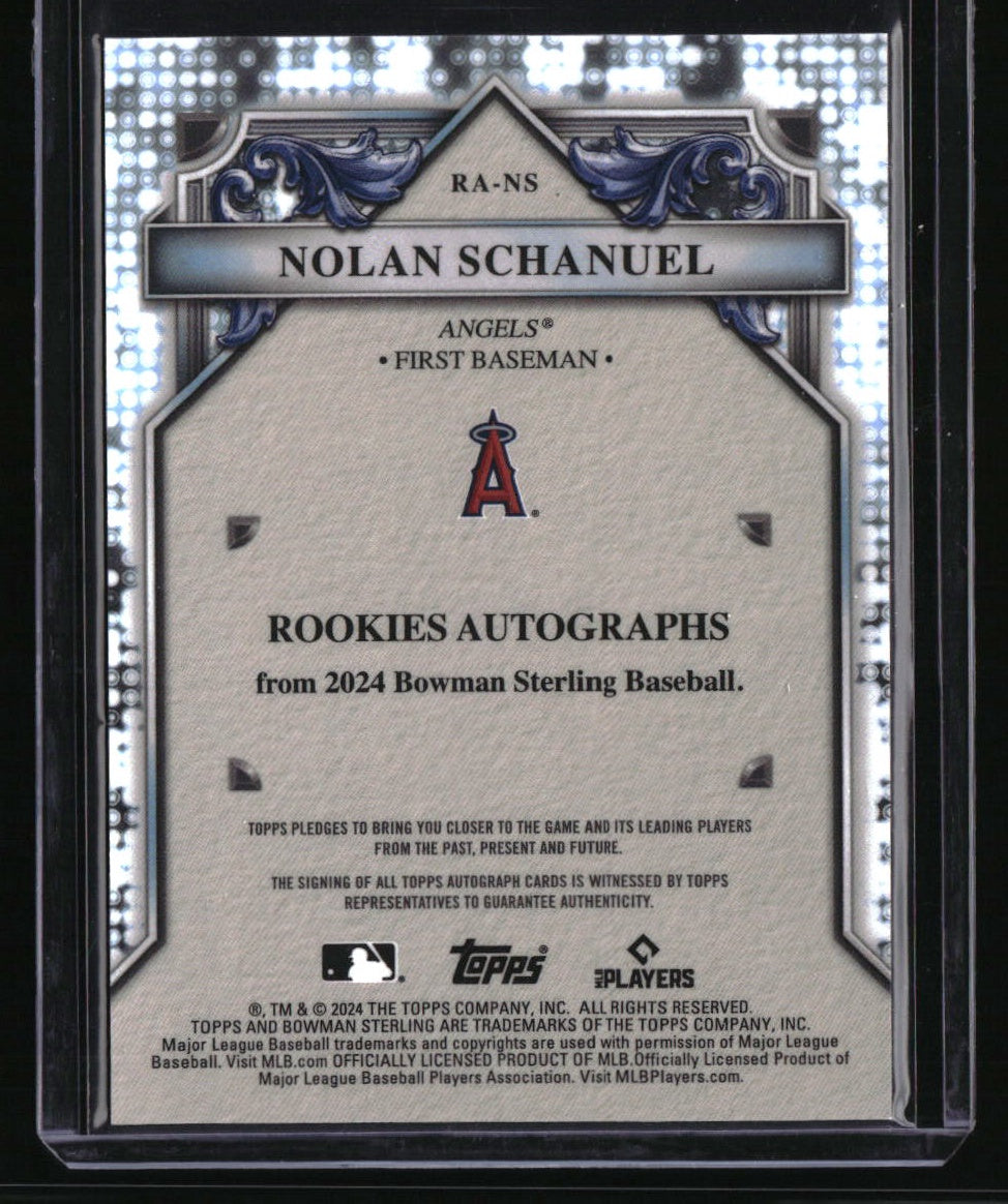 | *This is a Single Trading Card* | *Discounts are not available on Single Trading Cards* | This is a nice example of a 2024 Bowman Sterling #RA-NS Nolan Schanuel Rookie Autographs Orange Refractor SN,AU. Please check out our other listings for more great cards. Thank you for your interest in one of our cards!!! Prior to making any bids/purchases, I would kindly ask you to read the information below: Item Condition Please see the provided pictures for the condition of the card or item, pictures of the front and back are provided for your review. We cannot accommodate requests for additional pictures. Any notable flaws or damage to this item will be noted in this listing. Please use the attached photos provided for your own assessment. Graded card cases may come with some minor wear/tear, surface scratch, chipped, or blemish. There are no partial refunds or returns because of the case condition. All single cards will come in protective cases. If you purchase a listing that's sold as a lot it may come in snap cases or sealed in a team bag, and not all cards will be individually sleeved and top loaded in all lots. Raw cards are sold as such, with no guarantees of potential and/or expected grades. All cards are sold as is, with no returns or refunds. Listed With Mascot.