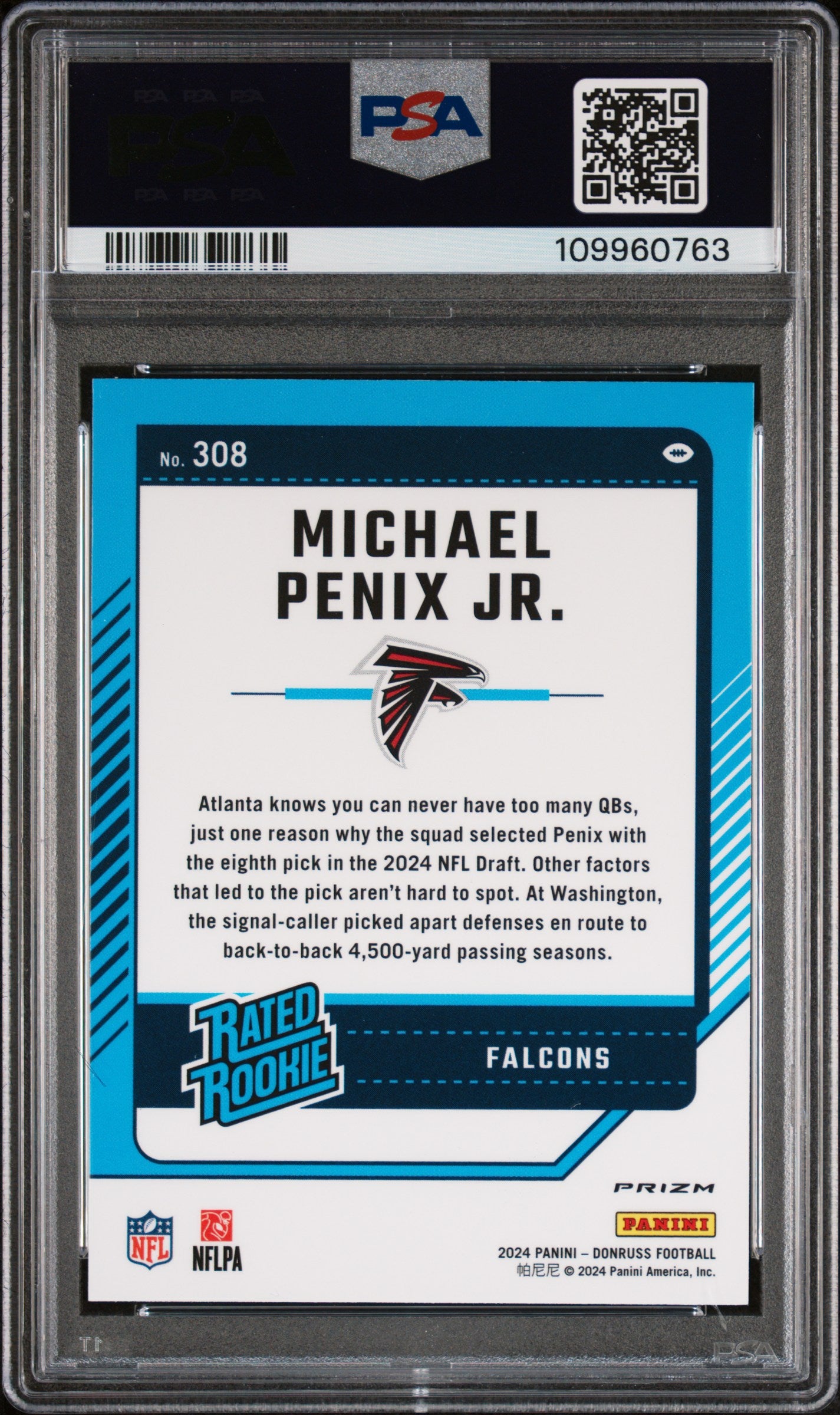 | *This is a Single Trading Card* | *Discounts are not available on Single Trading Cards* | This is a nice example of a 2024 Panini Donruss #308 Michael Penix Jr. Optic Preview-Red Wave PSA 10 GEM MT. Please check out our other listings for more great cards. Thank you for your interest in one of our cards!!! Prior to making any bids/purchases, I would kindly ask you to read the information below: Item Condition Please see the provided pictures for the condition of the card or item, pictures of the front and back are provided for your review. We cannot accommodate requests for additional pictures. Any notable flaws or damage to this item will be noted in this listing. Please use the attached photos provided for your own assessment. Graded card cases may come with some minor wear/tear, surface scratch, chipped, or blemish. There are no partial refunds or returns because of the case condition. All single cards will come in protective cases. If you purchase a listing that's sold as a lot it may come in snap cases or sealed in a team bag, and not all cards will be individually sleeved and top loaded in all lots. Raw cards are sold as such, with no guarantees of potential and/or expected grades. All cards are sold as is, with no returns or refunds. Listed With Mascot.