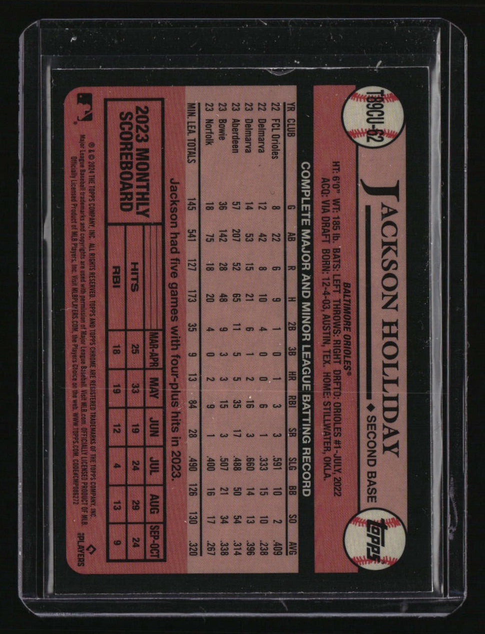 | *This is a Single Trading Card* | *Discounts are not available on Single Trading Cards* | This is a nice example of a 2024 Topps Update #T89CU-62 Jackson Holliday 1989 Topps Baseball 35th Anniversary Chrome Blue Refractors SN. Please check out our other listings for more great cards. Thank you for your interest in one of our cards!!! Prior to making any bids/purchases, I would kindly ask you to read the information below: Item Condition Please see the provided pictures for the condition of the card or item, pictures of the front and back are provided for your review. We cannot accommodate requests for additional pictures. Any notable flaws or damage to this item will be noted in this listing. Please use the attached photos provided for your own assessment. Graded card cases may come with some minor wear/tear, surface scratch, chipped, or blemish. There are no partial refunds or returns because of the case condition. All single cards will come in protective cases. If you purchase a listing that's sold as a lot it may come in snap cases or sealed in a team bag, and not all cards will be individually sleeved and top loaded in all lots. Raw cards are sold as such, with no guarantees of potential and/or expected grades. All cards are sold as is, with no returns or refunds. Listed With Mascot.