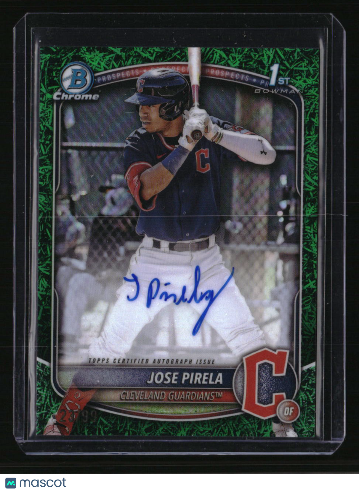 | *This is a Single Trading Card* | *Discounts are not available on Single Trading Cards* | This is a nice example of a 2025 Bowman #CPA-JP Jose Pirela Chrome Prospects Autographs Green Grass Refractor SN,AU. Please check out our other listings for more great cards. Thank you for your interest in one of our cards!!! Prior to making any bids/purchases, I would kindly ask you to read the information below: Item Condition Please see the provided pictures for the condition of the card or item, pictures of the front and back are provided for your review. We cannot accommodate requests for additional pictures. Any notable flaws or damage to this item will be noted in this listing. Please use the attached photos provided for your own assessment. Graded card cases may come with some minor wear/tear, surface scratch, chipped, or blemish. There are no partial refunds or returns because of the case condition. All single cards will come in protective cases. If you purchase a listing that's sold as a lot it may come in snap cases or sealed in a team bag, and not all cards will be individually sleeved and top loaded in all lots. Raw cards are sold as such, with no guarantees of potential and/or expected grades. All cards are sold as is, with no returns or refunds. Listed With Mascot.