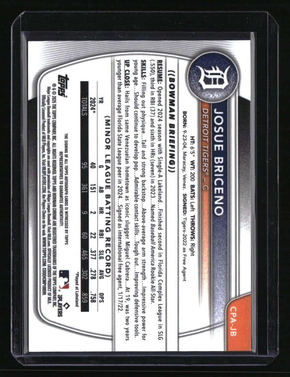 | *This is a Single Trading Card* | *Discounts are not available on Single Trading Cards* | This is a nice example of a 2025 Bowman #CPA-JB Josue Briceno Chrome Prospects Autographs Speckle Refractor SN,AU. Please check out our other listings for more great cards. Thank you for your interest in one of our cards!!! Prior to making any bids/purchases, I would kindly ask you to read the information below: Item Condition Please see the provided pictures for the condition of the card or item, pictures of the front and back are provided for your review. We cannot accommodate requests for additional pictures. Any notable flaws or damage to this item will be noted in this listing. Please use the attached photos provided for your own assessment. Graded card cases may come with some minor wear/tear, surface scratch, chipped, or blemish. There are no partial refunds or returns because of the case condition. All single cards will come in protective cases. If you purchase a listing that's sold as a lot it may come in snap cases or sealed in a team bag, and not all cards will be individually sleeved and top loaded in all lots. Raw cards are sold as such, with no guarantees of potential and/or expected grades. All cards are sold as is, with no returns or refunds. Listed With Mascot.