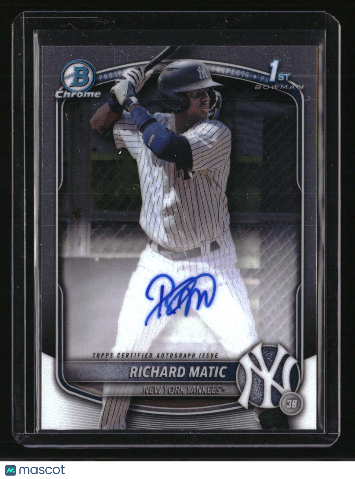 | *This is a Single Trading Card* | *Discounts are not available on Single Trading Cards* | This is a nice example of a 2025 Bowman #CPA-RM Richard Matic Chrome Prospects Autographs AU. Please check out our other listings for more great cards. Thank you for your interest in one of our cards!!! Prior to making any bids/purchases, I would kindly ask you to read the information below: Item Condition Please see the provided pictures for the condition of the card or item, pictures of the front and back are provided for your review. We cannot accommodate requests for additional pictures. Any notable flaws or damage to this item will be noted in this listing. Please use the attached photos provided for your own assessment. Graded card cases may come with some minor wear/tear, surface scratch, chipped, or blemish. There are no partial refunds or returns because of the case condition. All single cards will come in protective cases. If you purchase a listing that's sold as a lot it may come in snap cases or sealed in a team bag, and not all cards will be individually sleeved and top loaded in all lots. Raw cards are sold as such, with no guarantees of potential and/or expected grades. All cards are sold as is, with no returns or refunds. Listed With Mascot.