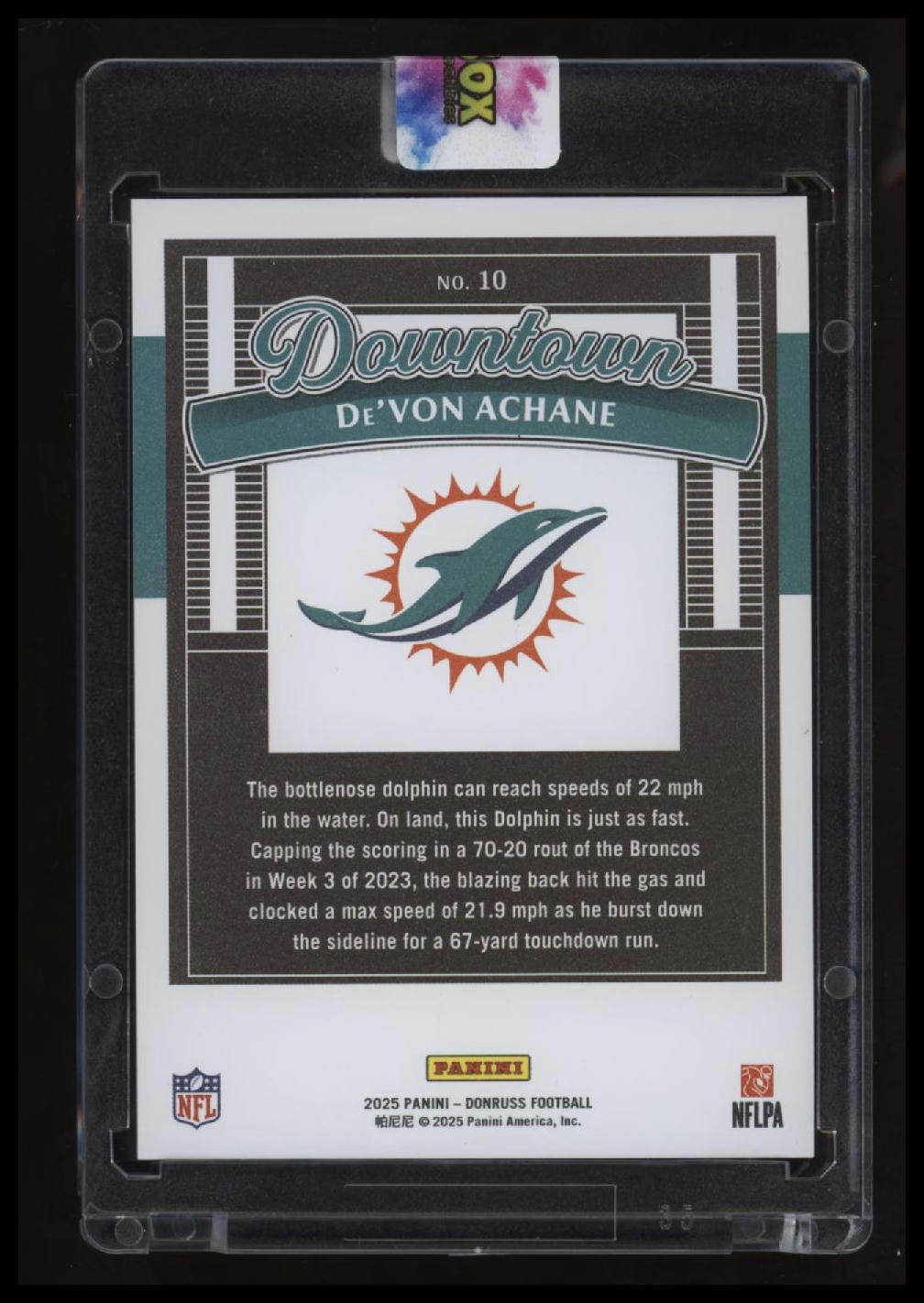 | *This is a Single Trading Card* | *Discounts are not available on Single Trading Cards* | This is a nice example of a 2025 Donruss #10 De’Von Achane Downtown! . Please check out our other listings for more great cards. Thank you for your interest in one of our cards!!! Prior to making any bids/purchases, I would kindly ask you to read the information below: Item Condition Please see the provided pictures for the condition of the card or item, pictures of the front and back are provided for your review. We cannot accommodate requests for additional pictures. Any notable flaws or damage to this item will be noted in this listing. Please use the attached photos provided for your own assessment. Graded card cases may come with some minor wear/tear, surface scratch, chipped, or blemish. There are no partial refunds or returns because of the case condition. All single cards will come in protective cases. If you purchase a listing that's sold as a lot it may come in snap cases or sealed in a team bag, and not all cards will be individually sleeved and top loaded in all lots. Raw cards are sold as such, with no guarantees of potential and/or expected grades. All cards are sold as is, with no returns or refunds. Listed With Mascot.