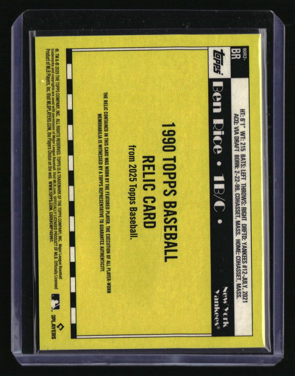 | *This is a Single Trading Card* | *Discounts are not available on Single Trading Cards* | This is a nice example of a 2025 Topps #90R2-BR Ben Rice 1990 Topps Baseball 35th Anniversary Relics (Series Two) MEM. Please check out our other listings for more great cards. Thank you for your interest in one of our cards!!! Prior to making any bids/purchases, I would kindly ask you to read the information below: Item Condition Please see the provided pictures for the condition of the card or item, pictures of the front and back are provided for your review. We cannot accommodate requests for additional pictures. Any notable flaws or damage to this item will be noted in this listing. Please use the attached photos provided for your own assessment. Graded card cases may come with some minor wear/tear, surface scratch, chipped, or blemish. There are no partial refunds or returns because of the case condition. All single cards will come in protective cases. If you purchase a listing that's sold as a lot it may come in snap cases or sealed in a team bag, and not all cards will be individually sleeved and top loaded in all lots. Raw cards are sold as such, with no guarantees of potential and/or expected grades. All cards are sold as is, with no returns or refunds. Listed With Mascot.
