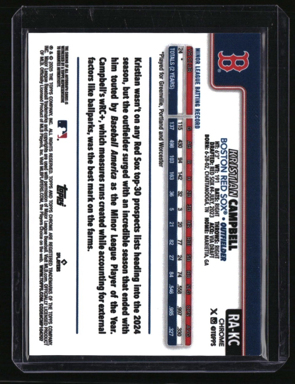 | *This is a Single Trading Card* | *Discounts are not available on Single Trading Cards* | This is a nice example of a 2025 Topps Chrome Update #RA-KC Kristian Campbell Rookie Lava Lamp Autographs Blue/Green Refractors SN,AU. Please check out our other listings for more great cards. Thank you for your interest in one of our cards!!! Prior to making any bids/purchases, I would kindly ask you to read the information below: Item Condition Please see the provided pictures for the condition of the card or item, pictures of the front and back are provided for your review. We cannot accommodate requests for additional pictures. Any notable flaws or damage to this item will be noted in this listing. Please use the attached photos provided for your own assessment. Graded card cases may come with some minor wear/tear, surface scratch, chipped, or blemish. There are no partial refunds or returns because of the case condition. All single cards will come in protective cases. If you purchase a listing that's sold as a lot it may come in snap cases or sealed in a team bag, and not all cards will be individually sleeved and top loaded in all lots. Raw cards are sold as such, with no guarantees of potential and/or expected grades. All cards are sold as is, with no returns or refunds.